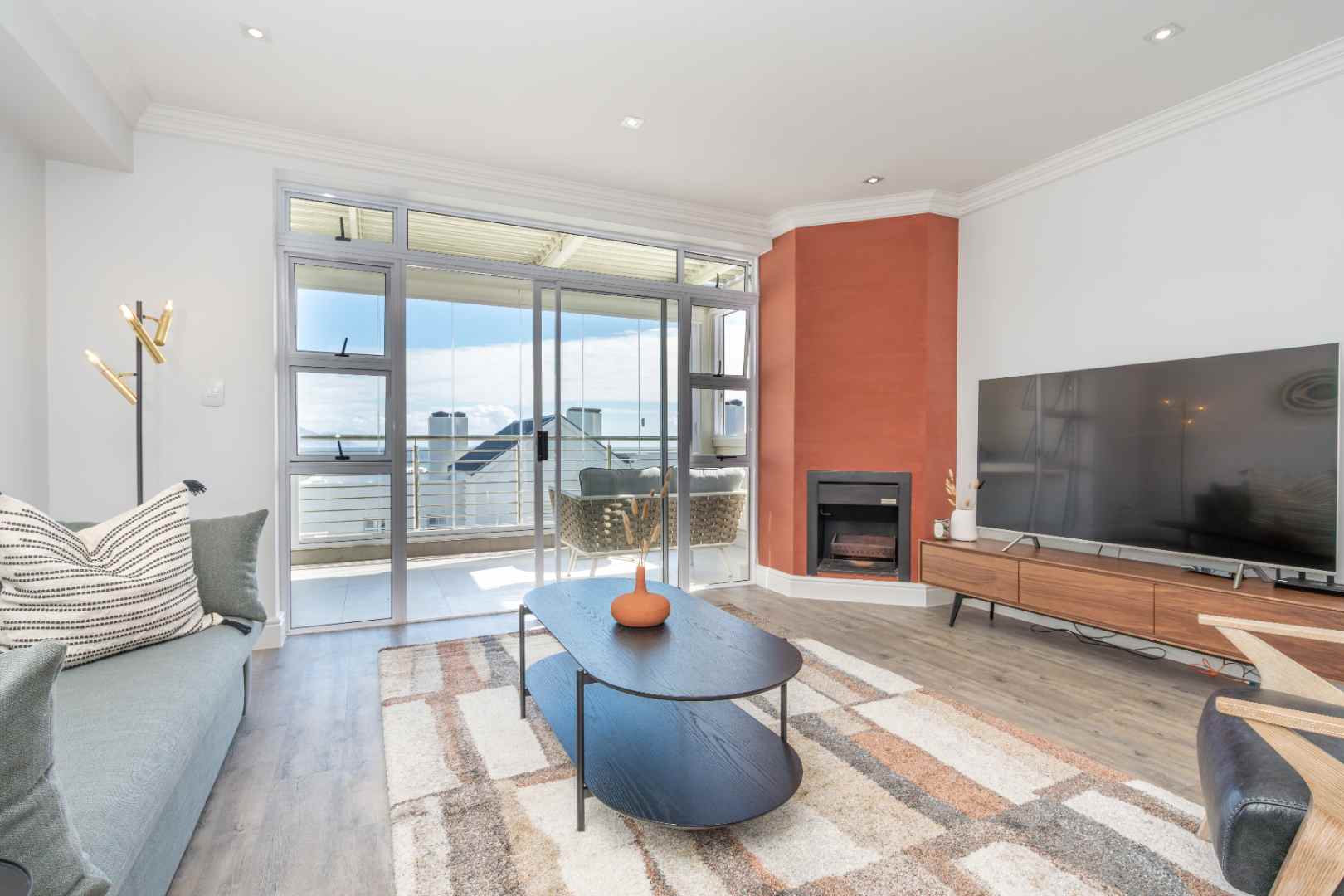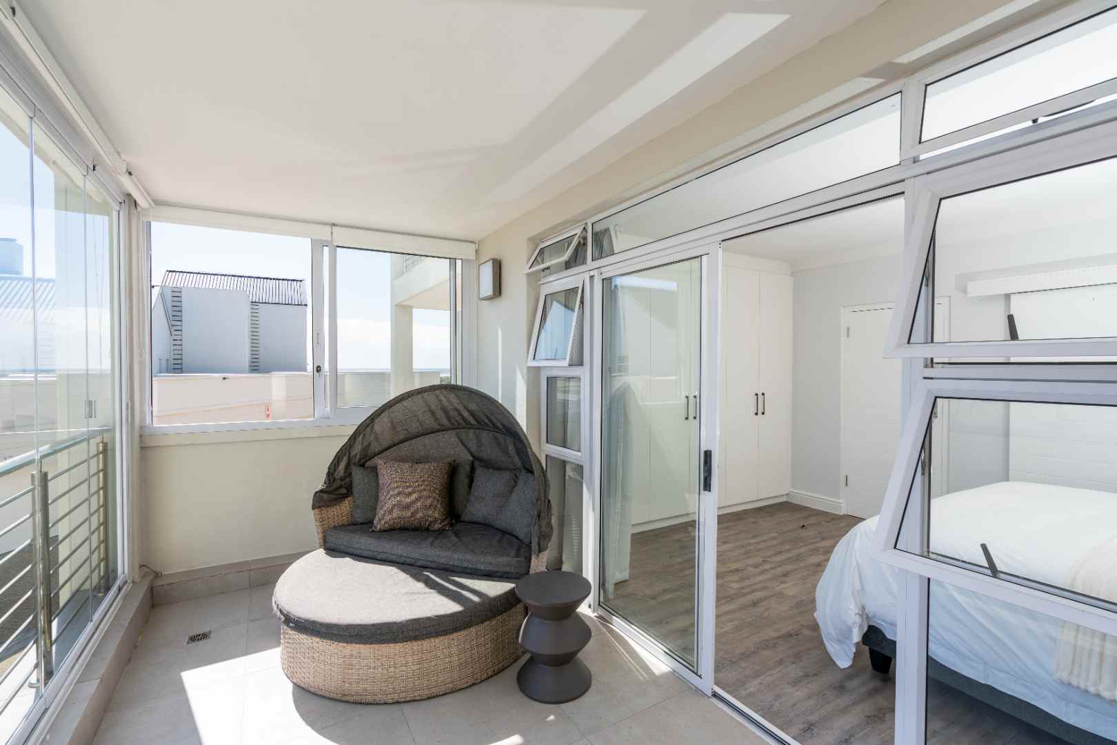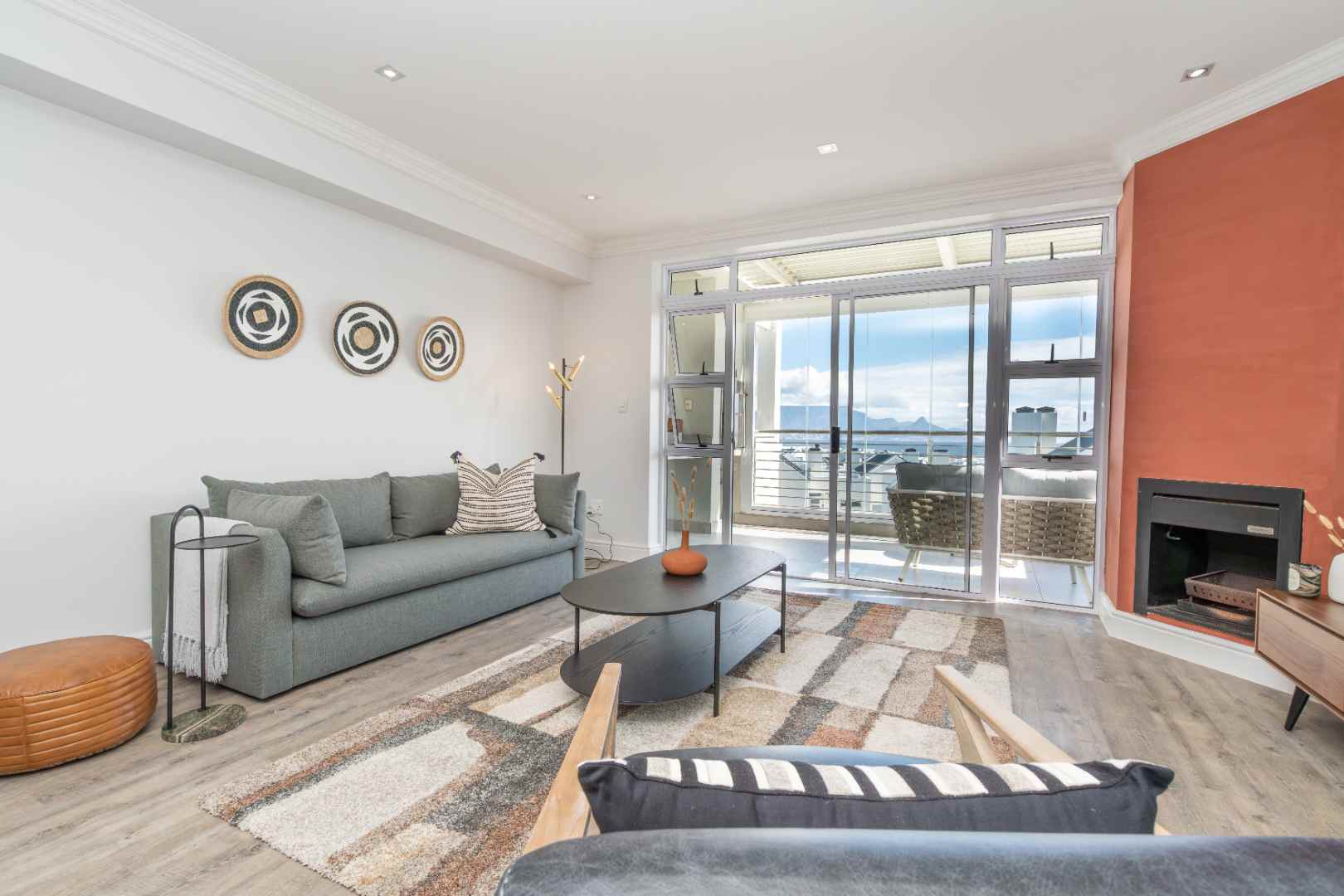 Slide open the doors to the enclosed second balcony, where comfortable outdoor seating and a gas braai invite you to relax and soak in the panoramic, uninterrupted views of the Table Mountain backdrop.