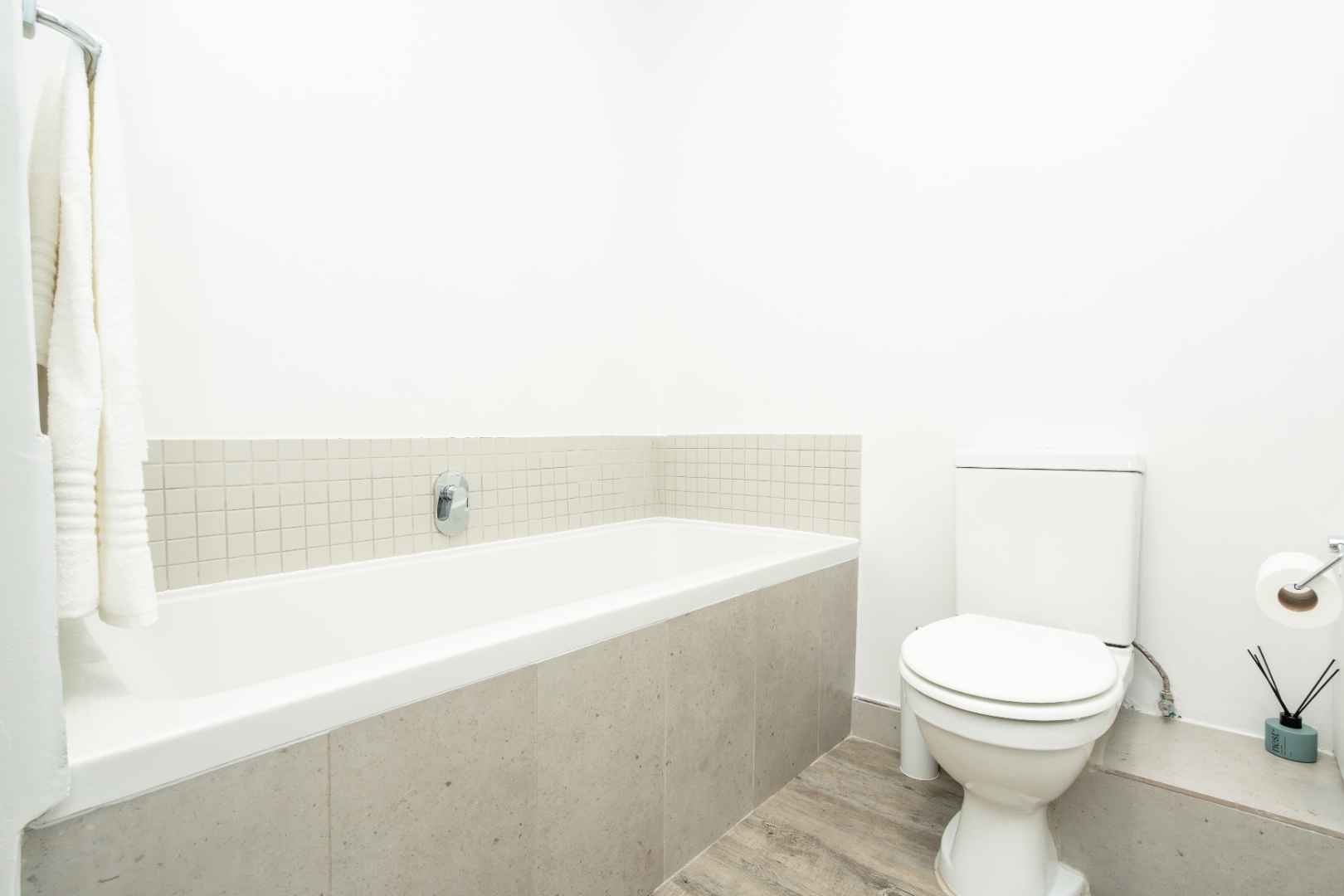 2 Bedrooms. The first bedroom features two comfortable single beds and access to a separate bathroom with a tub and shower.