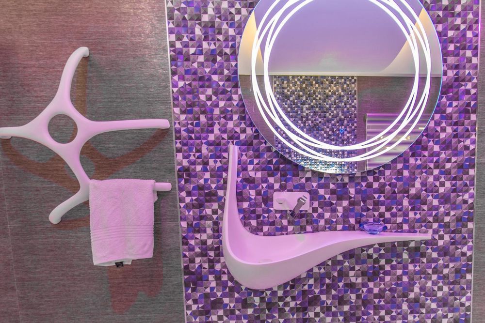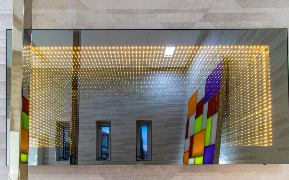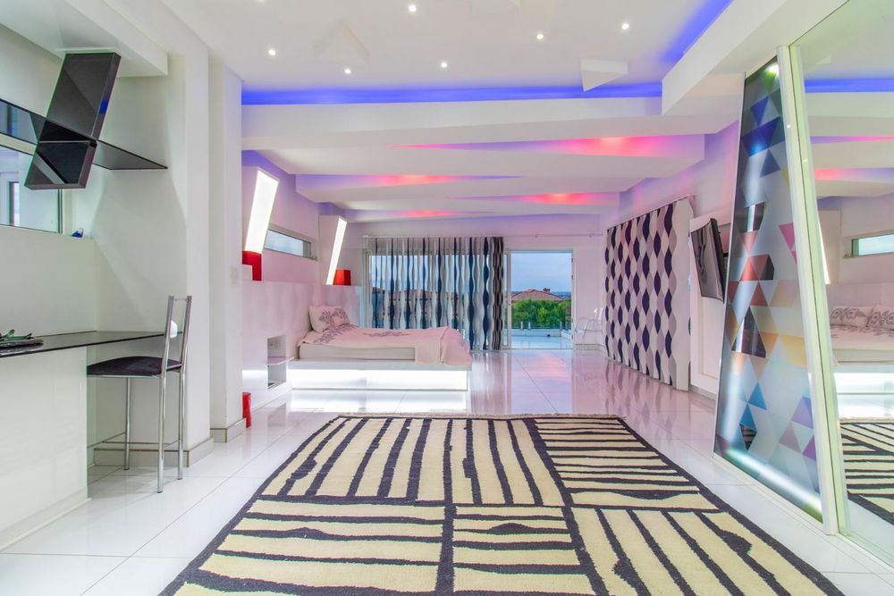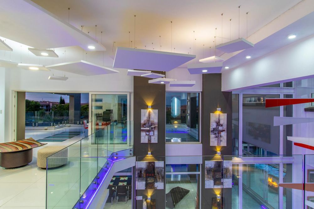 The outdoor space is equally impressive, with frameless glass balustrades along the pool and balconies, aesthetic privacy screens, and sweeping city views. Skylights flood the interior with natural light, complemented by artistic lighting features throughout. The cocktail bar and lounge area provide the perfect setting for socializing, while custom-made geometric ceilings with changing lights add a modern touch.