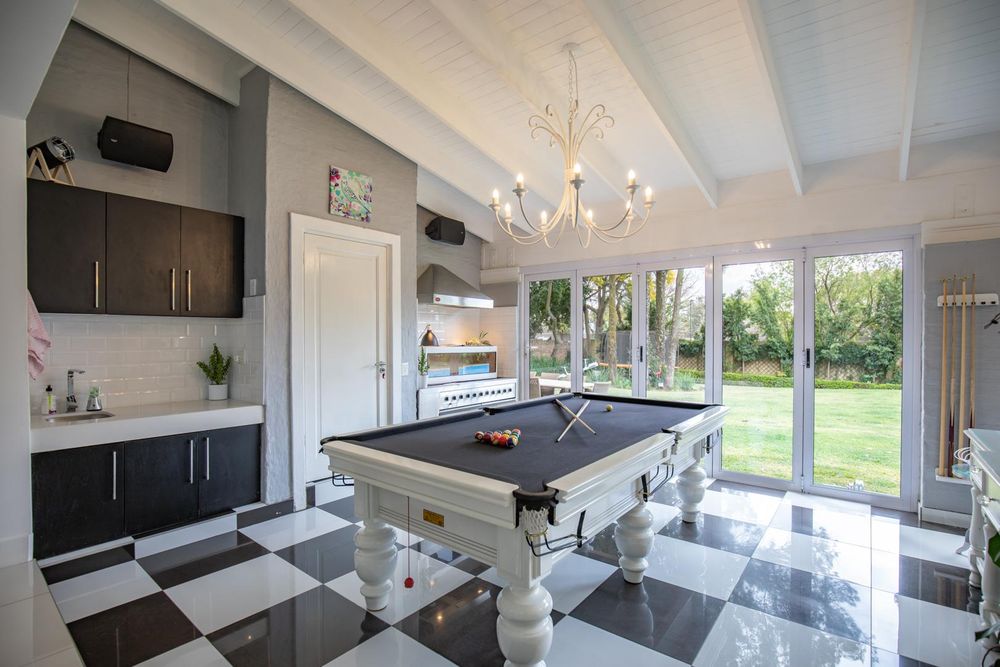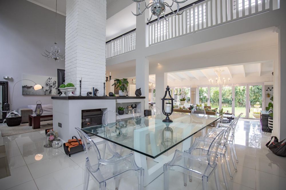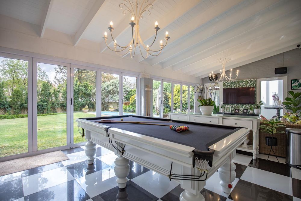 The majestic double-volume entrance boasts breathtaking views of the lush garden and elegantly divides the house. To the right, you will find the family room and a generously equipped kitchen featuring ample cupboard space, a pantry, scullery, a fireplace, two built-in ovens, a steamer, a Miele microwave, and Siemens gas and electric stove. To the left, enormous living spaces unfold, including formal dining and entertainment rooms, marked by double-volume ceilings and leading into an enclosed patio with a built-in braai, pool room, and more.