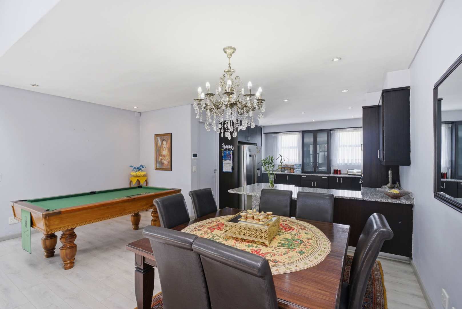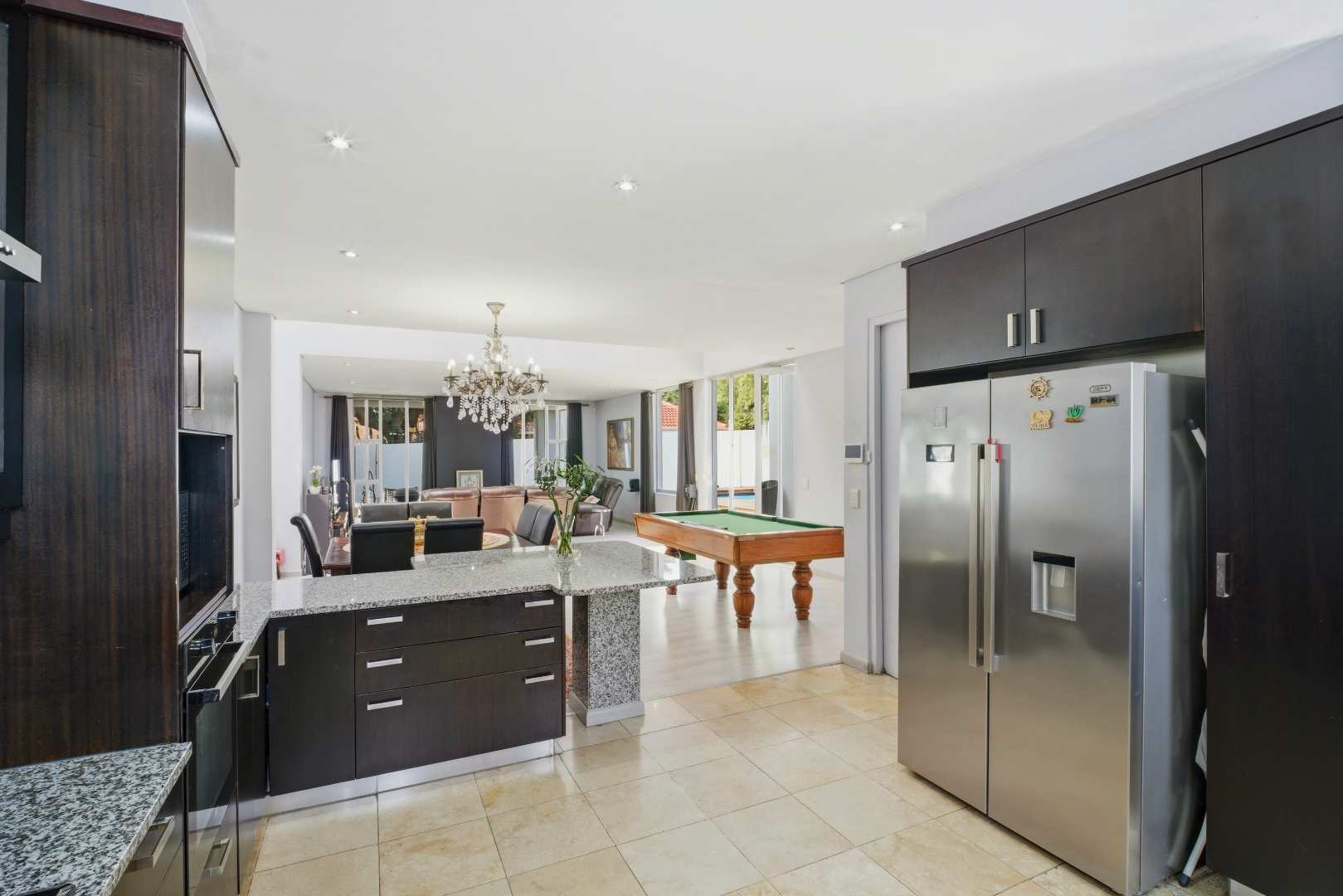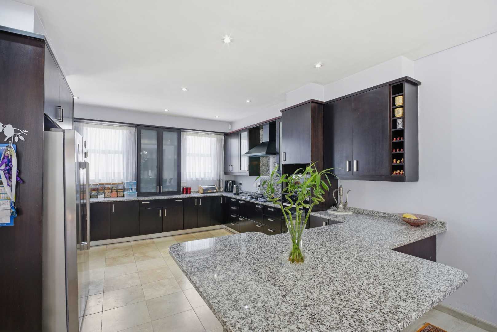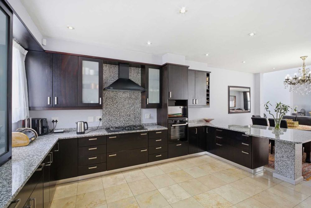 Upon entering the home, you are greeted by a grand pivot glass door that opens into a breathtaking space characterized by a double-volume ceiling. Skylights and numerous downlights illuminate the area, creating an inviting and airy atmosphere. The kitchen is a chef's dream, featuring solid mahogany cupboards and pristine granite countertops, complemented by a walk-in pantry and scullery with space for three appliances.
