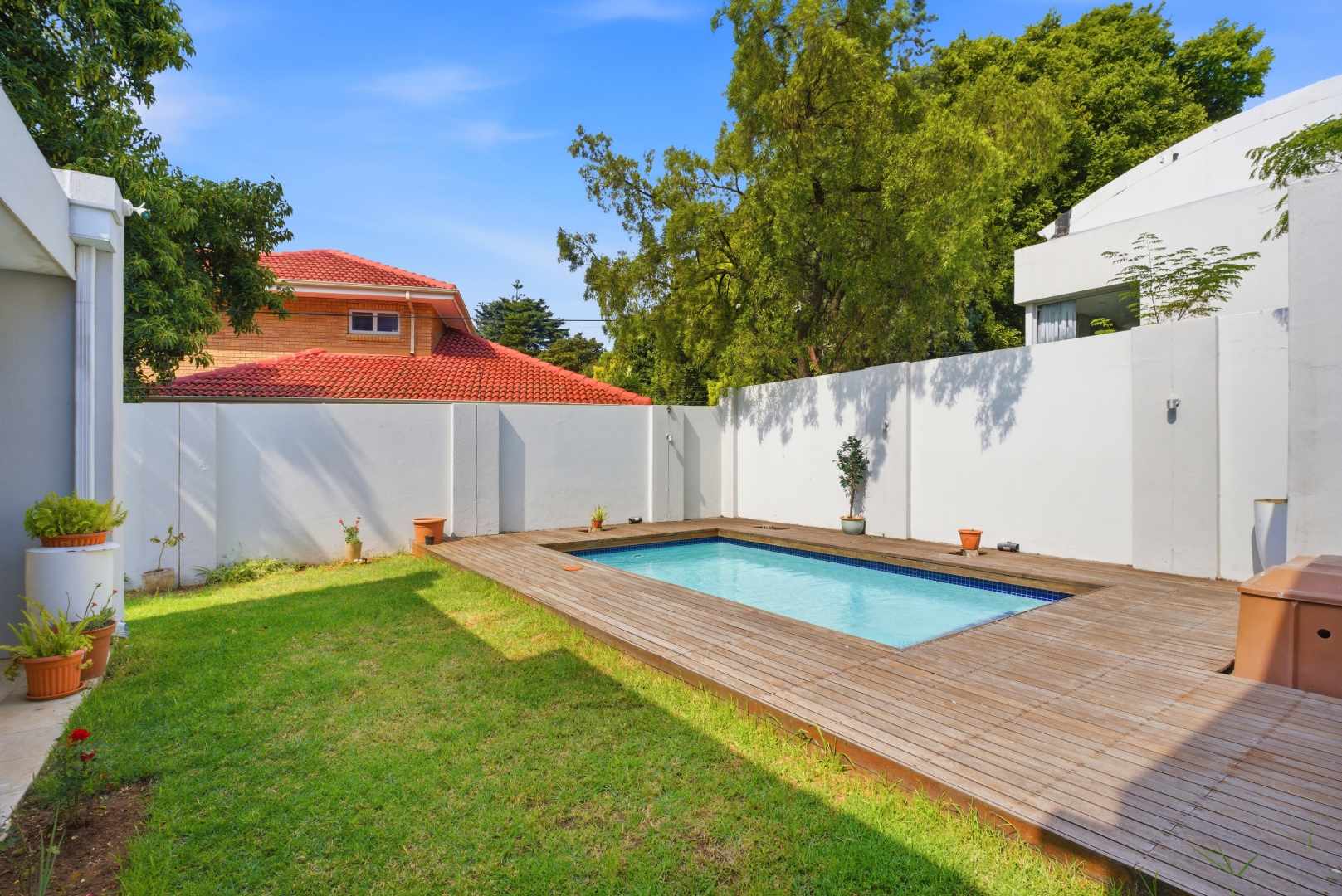 Security is paramount in this exclusive enclave, with not one but two gates providing access to the home. The first gate is shared with just two neighbors, leading into a private yard secured by a second gate, offering peace of mind and a serene living environment.
