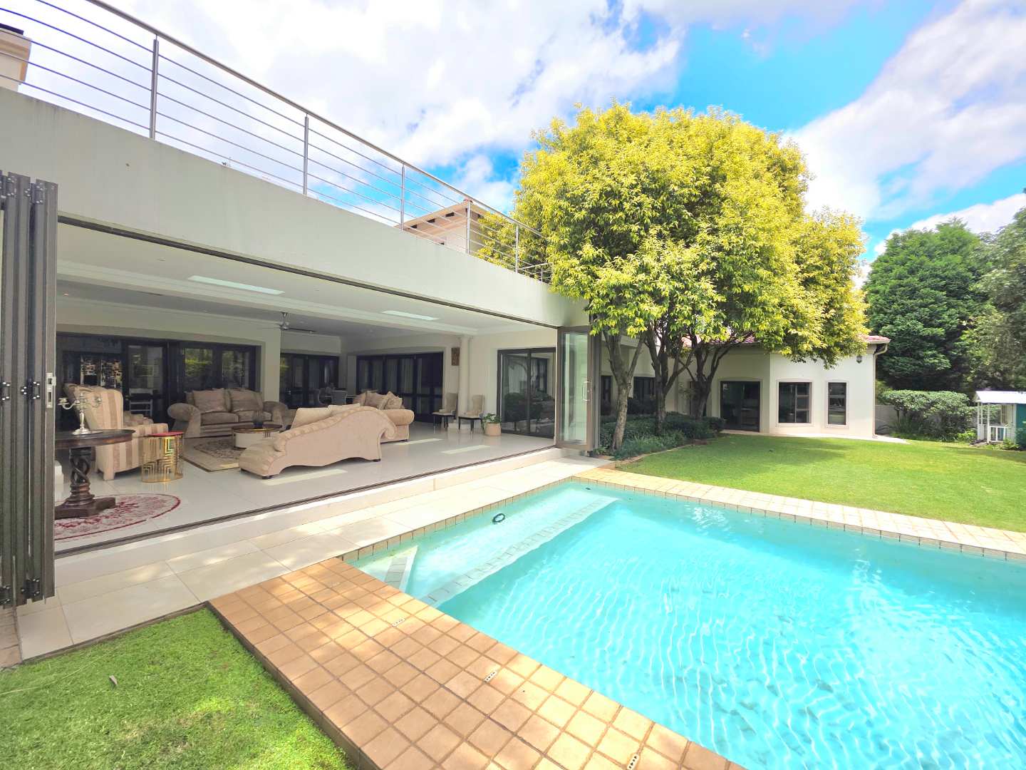 Full-height sliding stackable doors opening onto the garden and pool