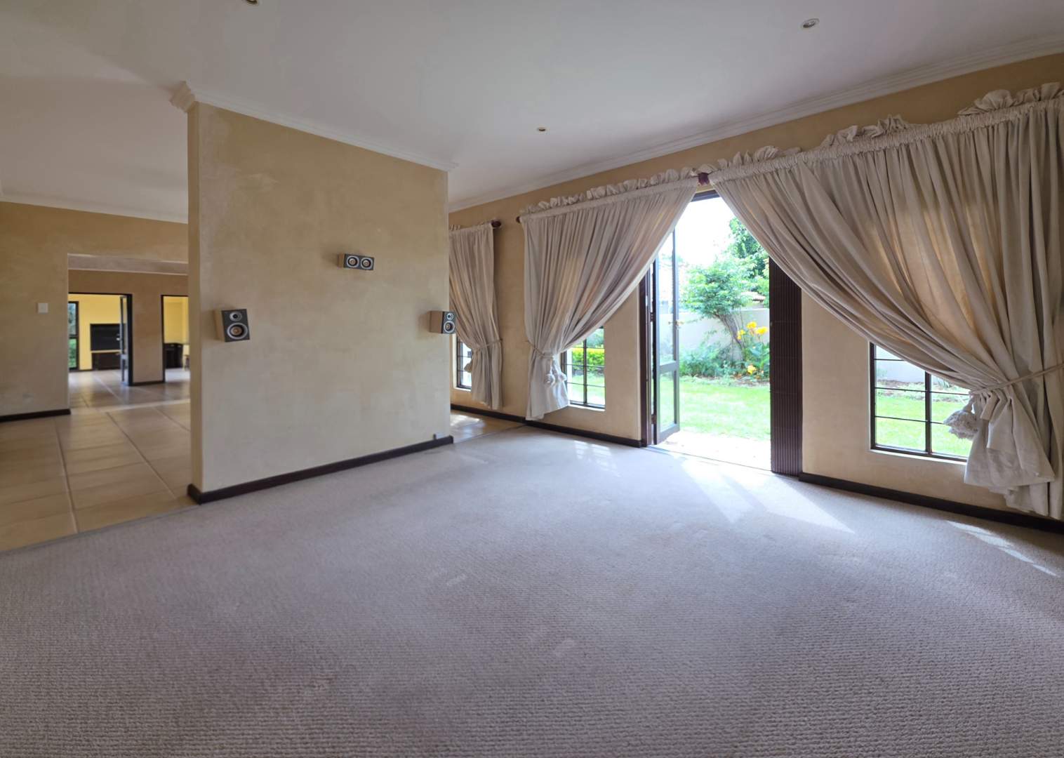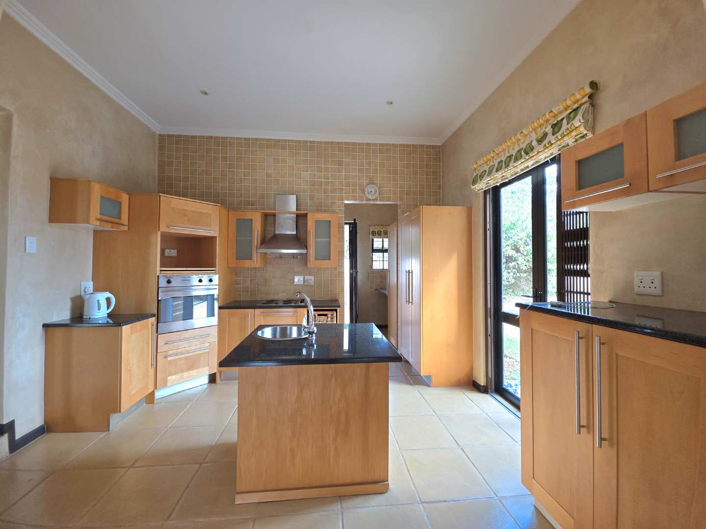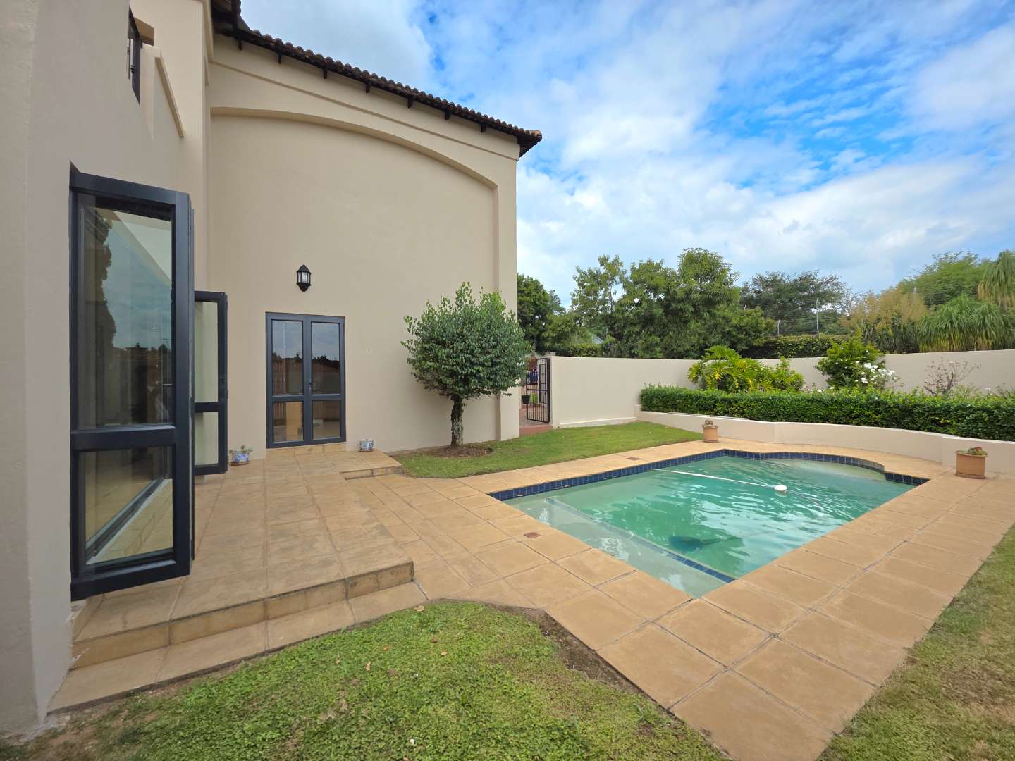 The kitchen with scullery opens onto a dining room, which leads to a closed entertainment patio with a built-in braai—ideal for year-round entertaining. The patio overlooks the garden and swimming pool, creating a relaxed outdoor lifestyle.