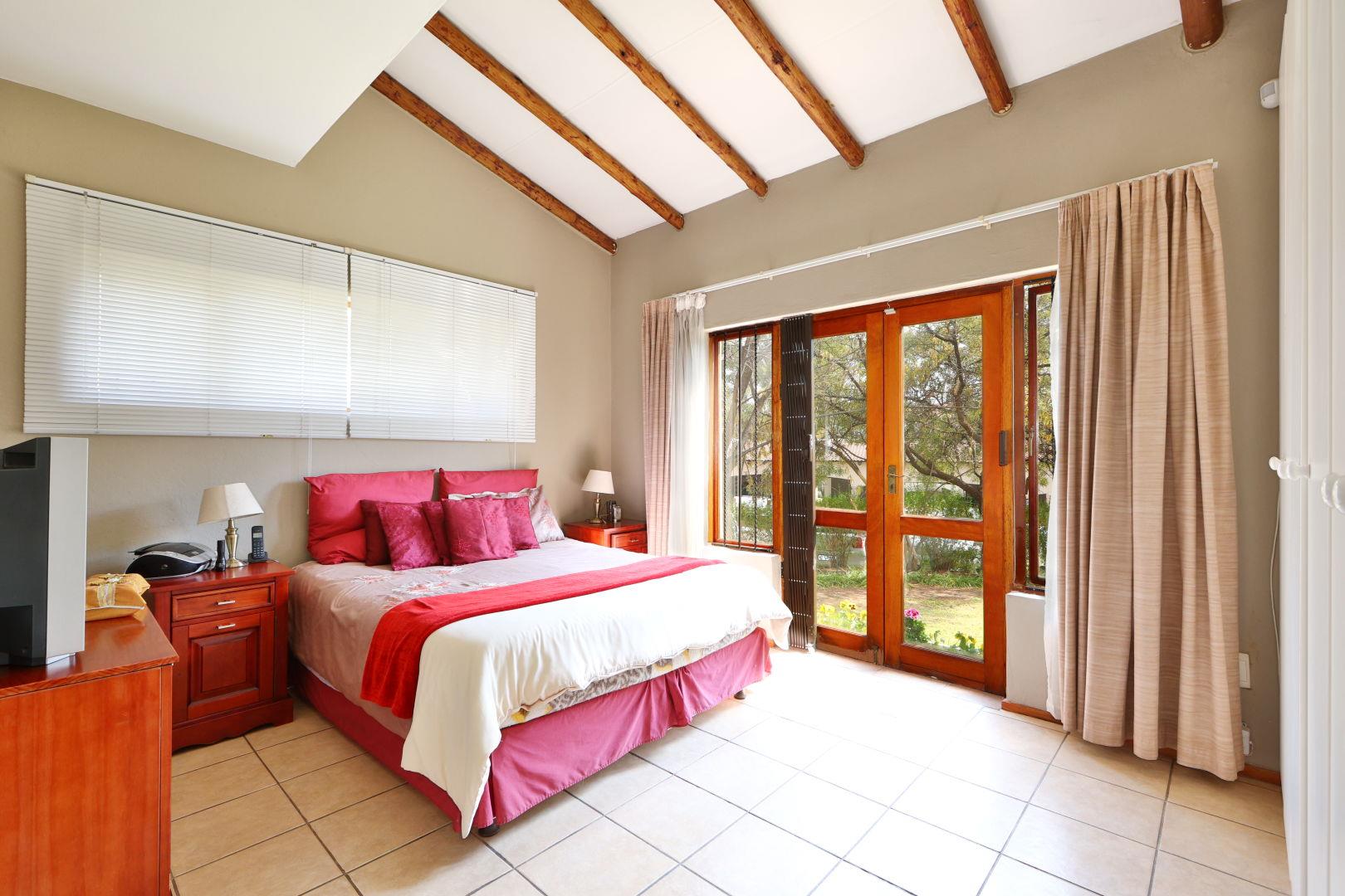 The large sunny main bedroom with double volume ceiling, opens onto the garden via a glass door and has a modern en-suite bathroom with shower. It has large built-in cupboards.