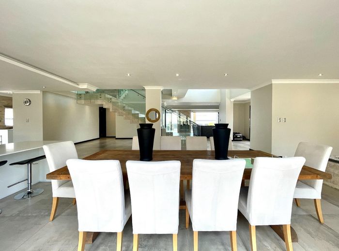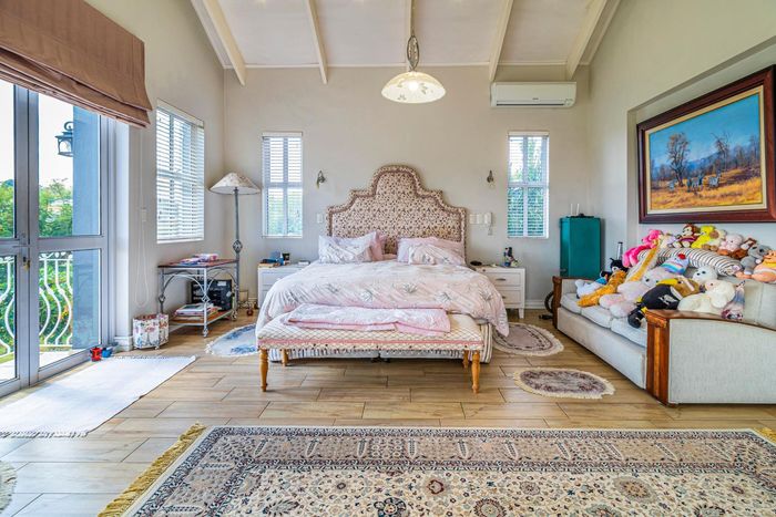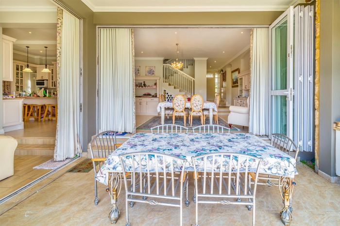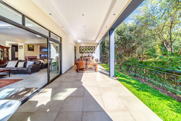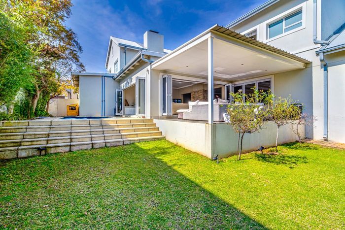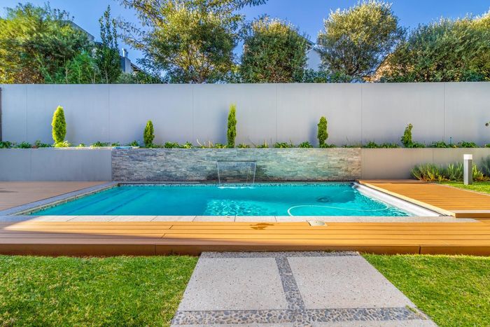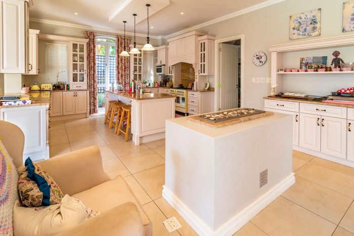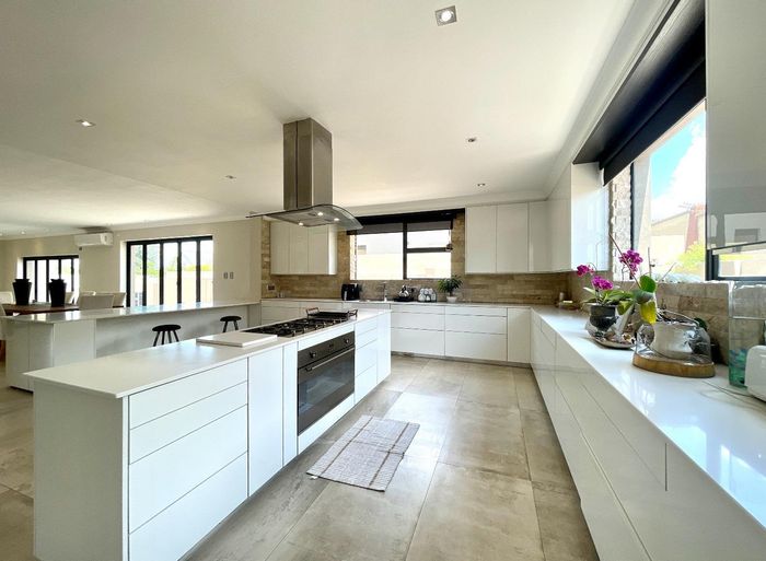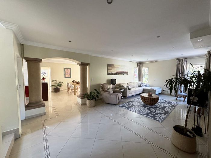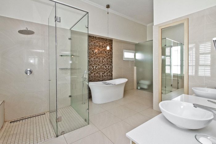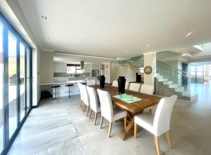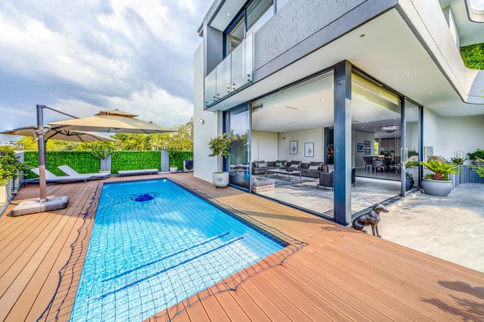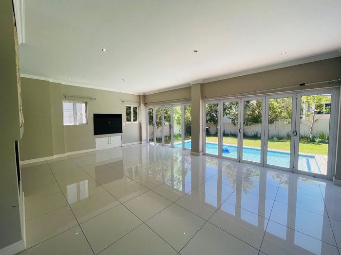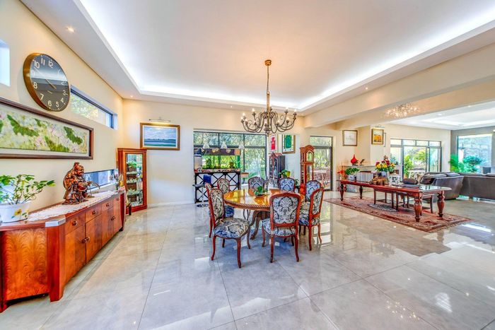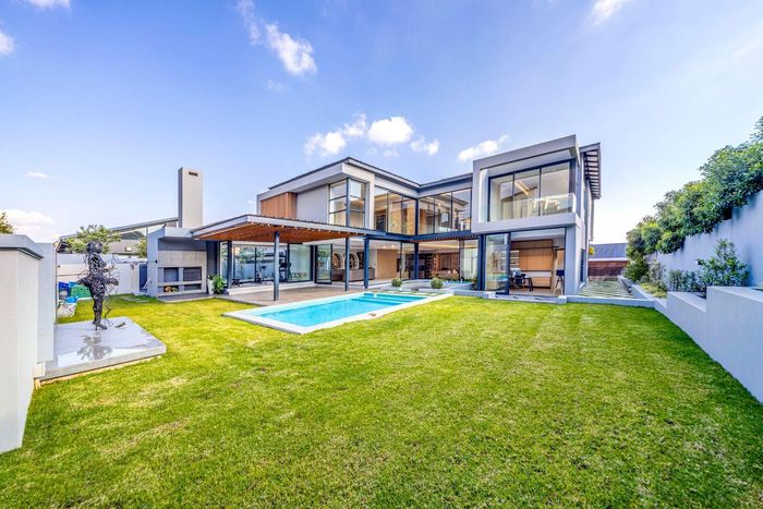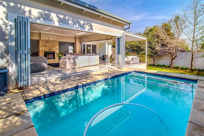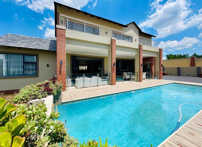 Entertainer's dream with pool and dual braai decks, set in a peaceful, leafy neighbourhood offering expansive garden living; open-plan kitchen, five bedrooms (all ensuites), 5.5 baths, double garage.