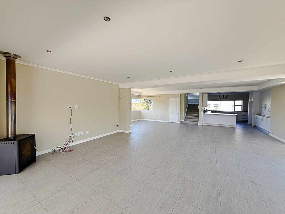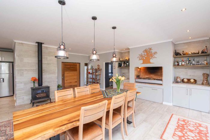 The open-plan living area includes a lounge with a wood-burning fireplace, dining space, guest toilet, built-in bar, and indoor stainless-steel braai. Stacker doors open onto a north-facing wooden deck and fully enclosed, pet-friendly garden bordered by clear-view fencing and green belts for added privacy.