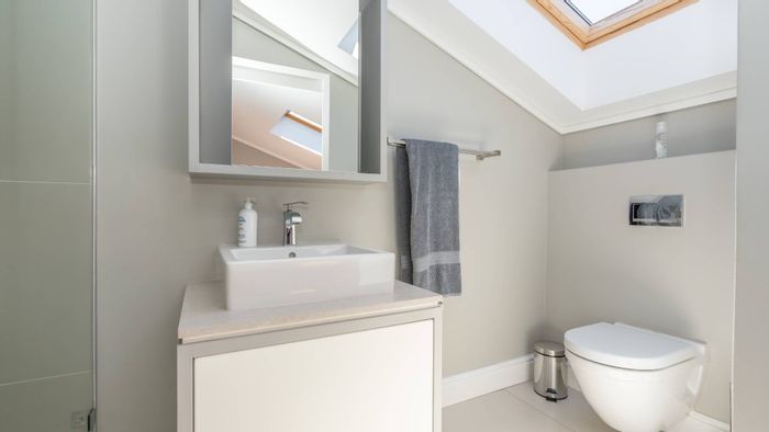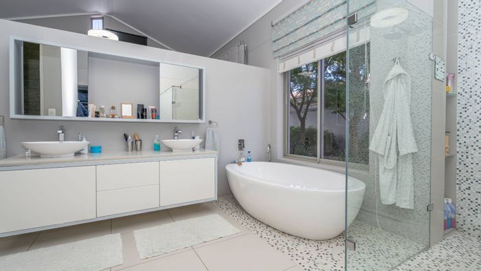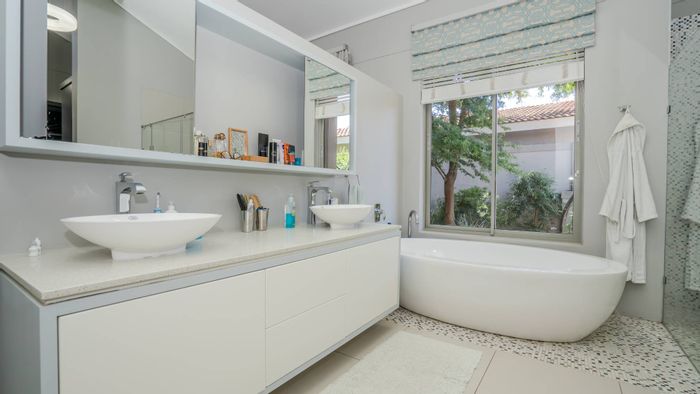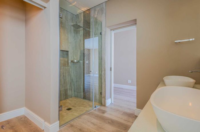 Upstairs, all three bedrooms have en-suite bathrooms and heated towel rails. The main suite includes a private balcony with views, built-in cupboards, American shutters, and a tilted awning. Guest bedrooms share similar lagoon views. Additional features include a private office and a large linen/storage room.