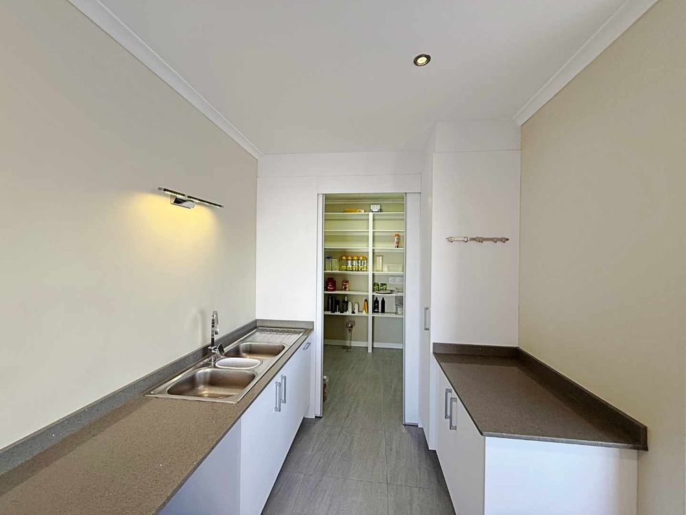 The kitchen features Caesarstone countertops, a 5-burner gas hob, electric oven, soft-close cupboards, a large walk-in pantry, and a separate scullery/laundry with its own drying courtyard.