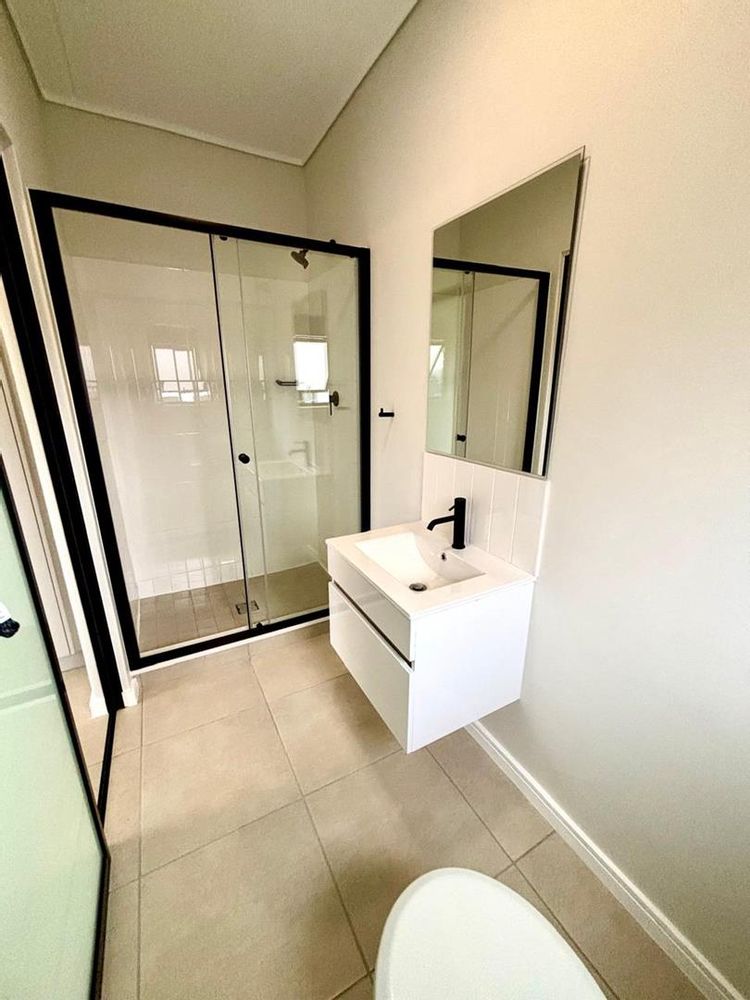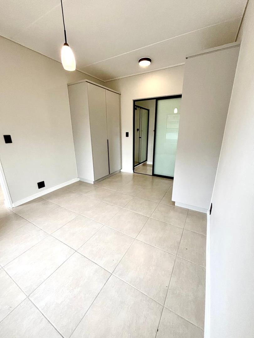 The spacious bedroom offers ample built-in cupboards, while the modern bathroom is fitted with a stylish shower and toilet.
