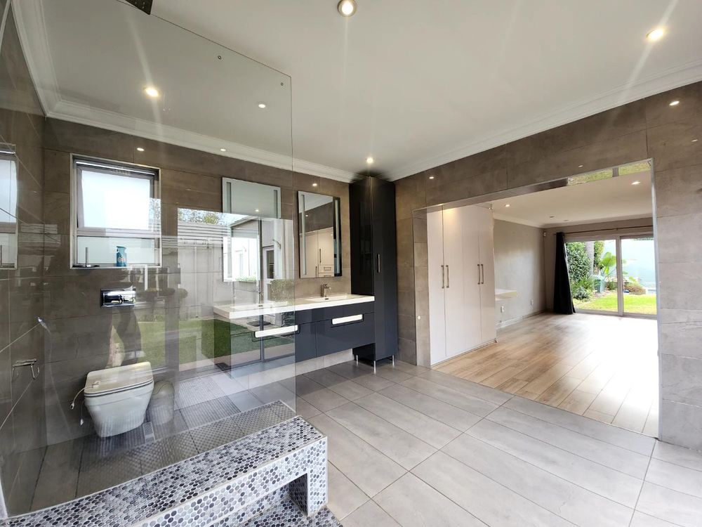 Main suite with double shower, double vanity, and sliding doors opening to a private, manicured garden