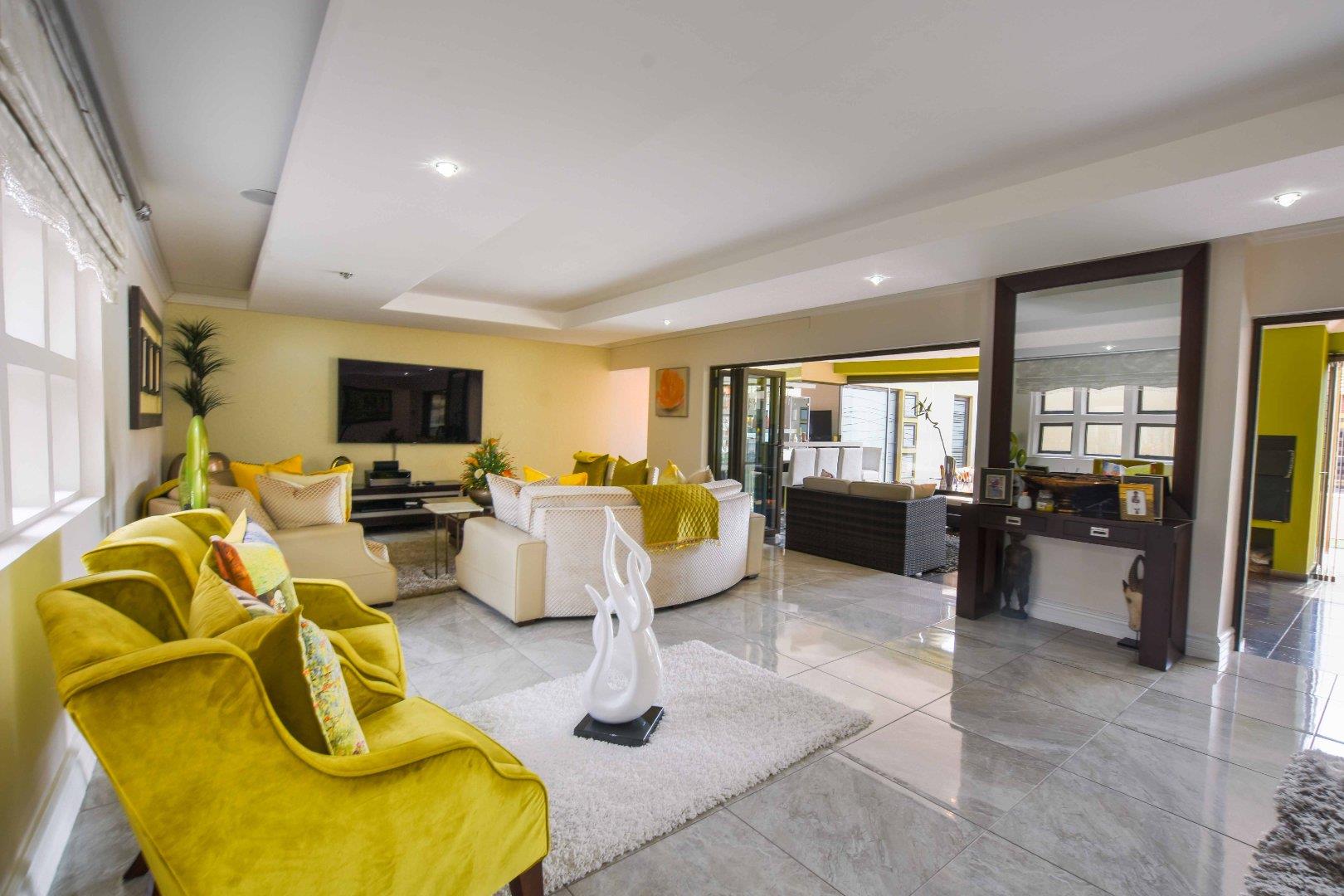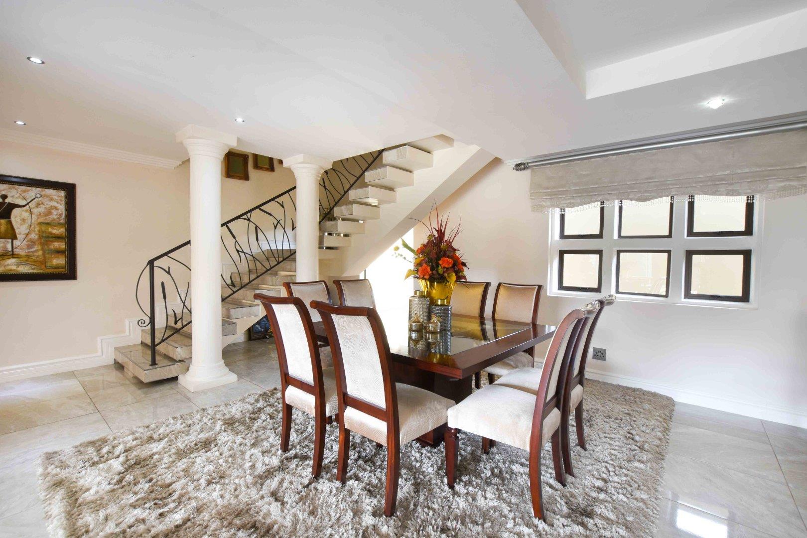The interior of this home is a masterpiece of spatial design and luxury. It features two distinct living areas: a formal lounge that exudes sophistication and a relaxed TV lounge designed for comfort. The elegant dining area serves as the perfect setting for hosting memorable gatherings.