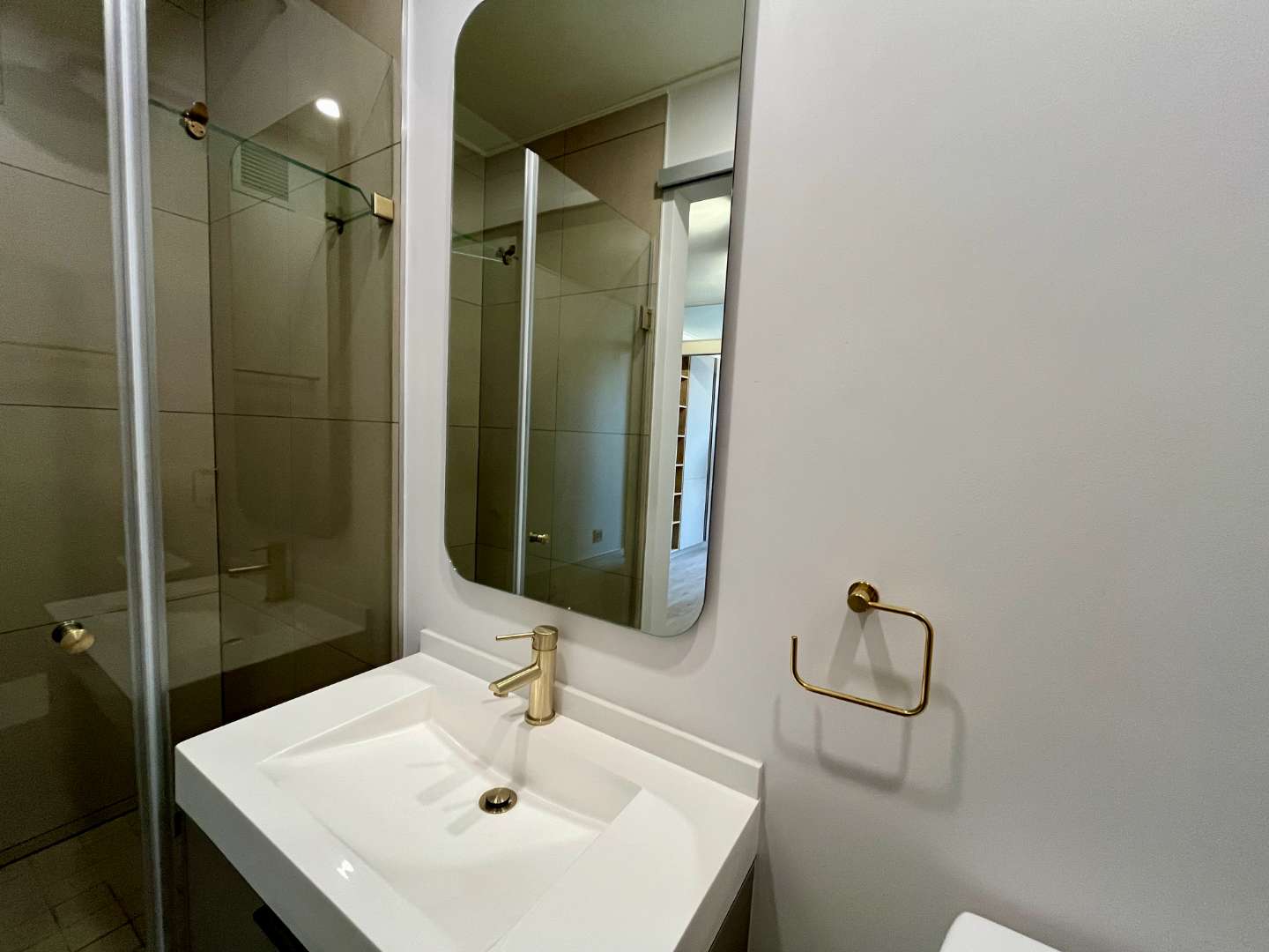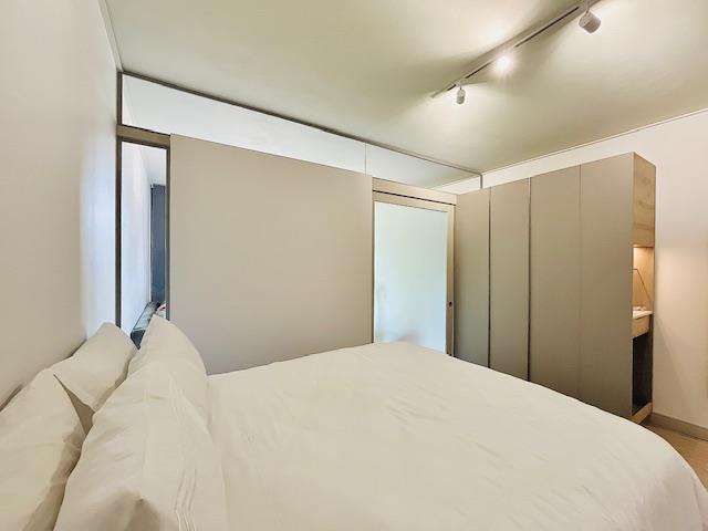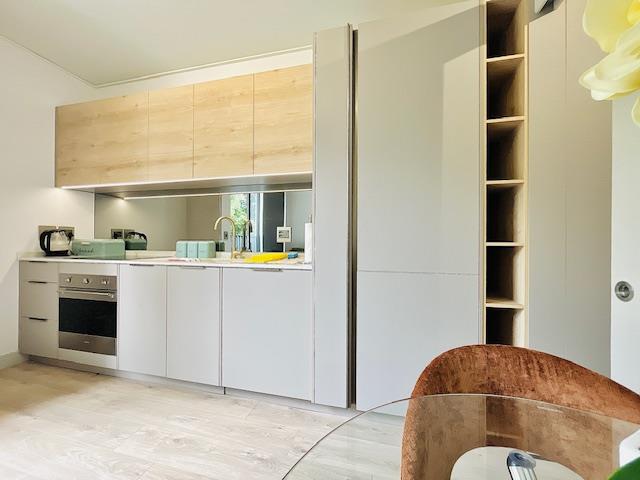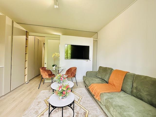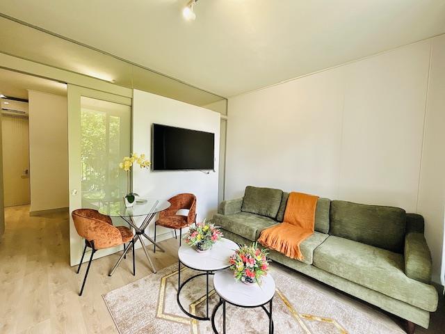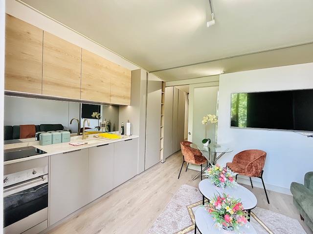 This meticulously designed studio apartment seamlessly combines style, functionality, and luxury: