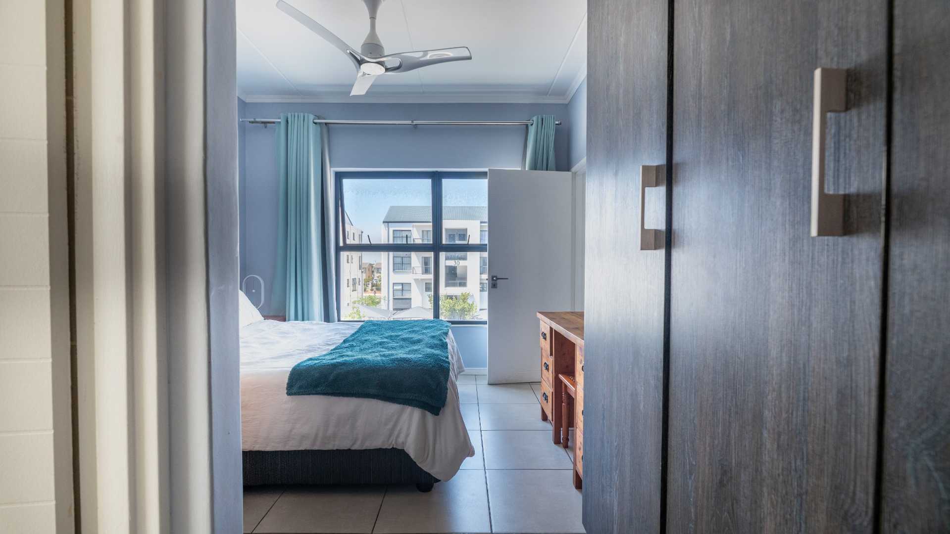 The apartment offers an open-plan living and kitchen area, a well-sized bedroom, and a modern bathroom. Uniquely, the bedroom includes additional built-in cupboard space, ideal for extra clothing, luggage, or storage, a rare feature in one-bedroom apartments.