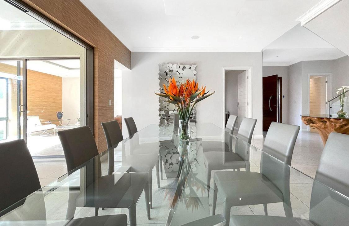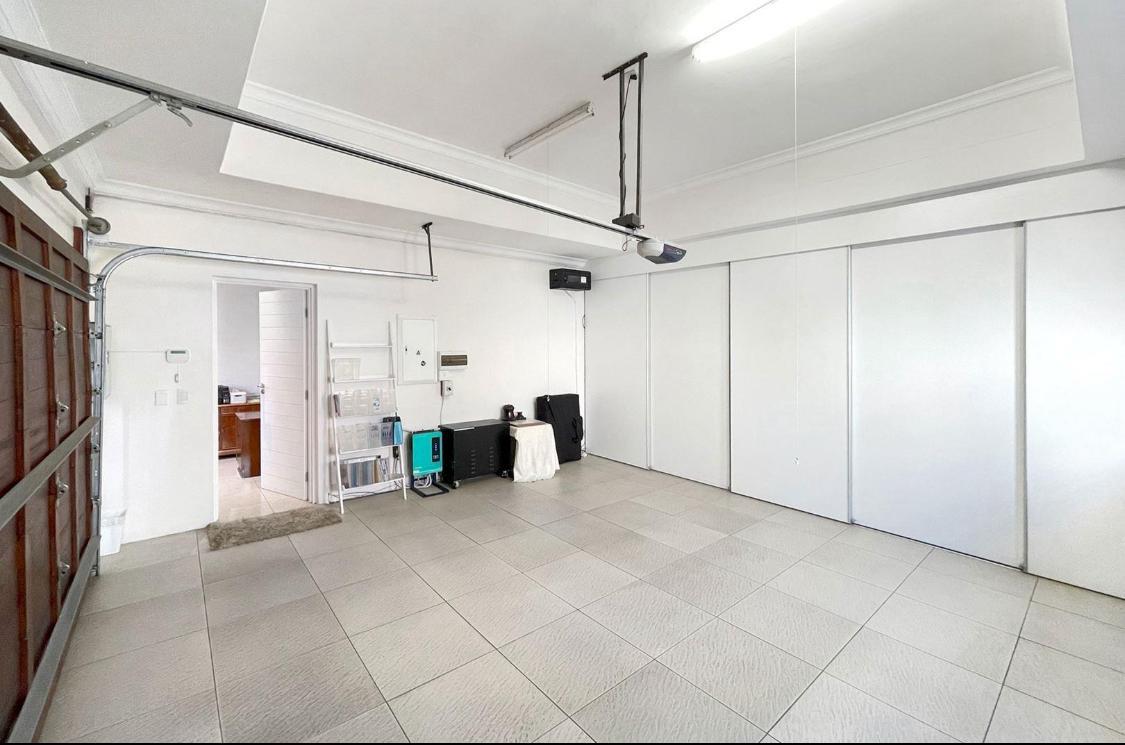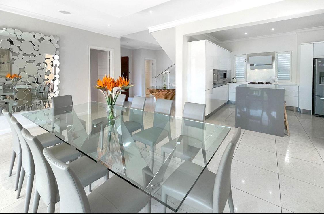 The sleek, modern kitchen is a focal point of the home, fitted with Caesarstone countertops, integrated Whirlpool appliances, a gas hob, dual ovens, and a generous island. A separate scullery and laundry area adds practicality to the elegance.
