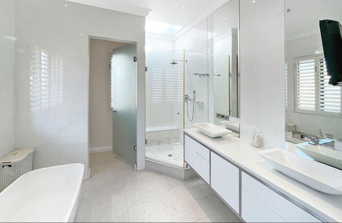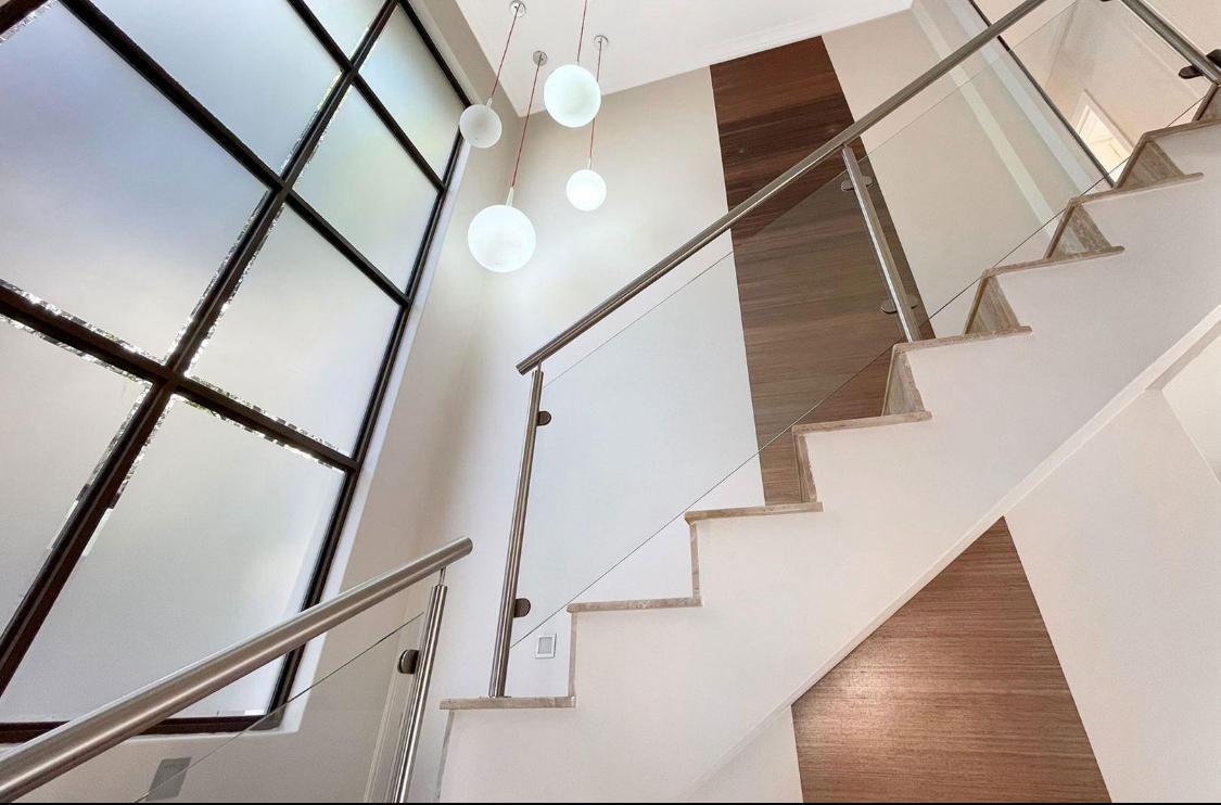 Natural light streams through large glass doors and windows, enhancing the home’s bright and airy atmosphere. A striking floating staircase leads to a pyjama lounge and the bedroom wing, where comfort meets tranquility.