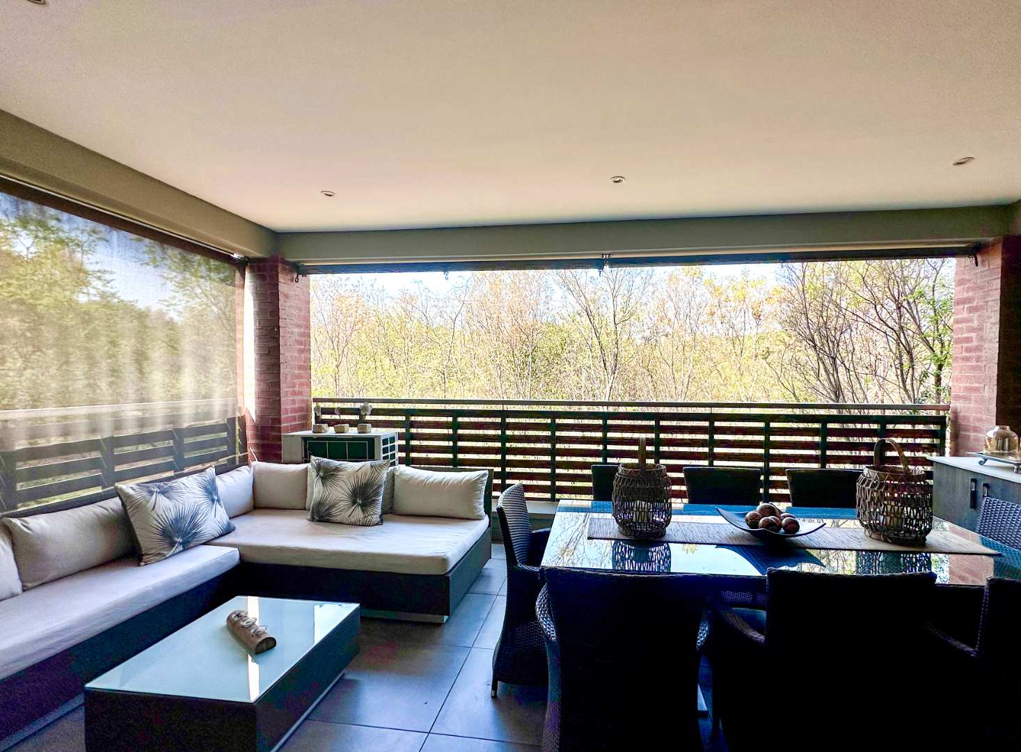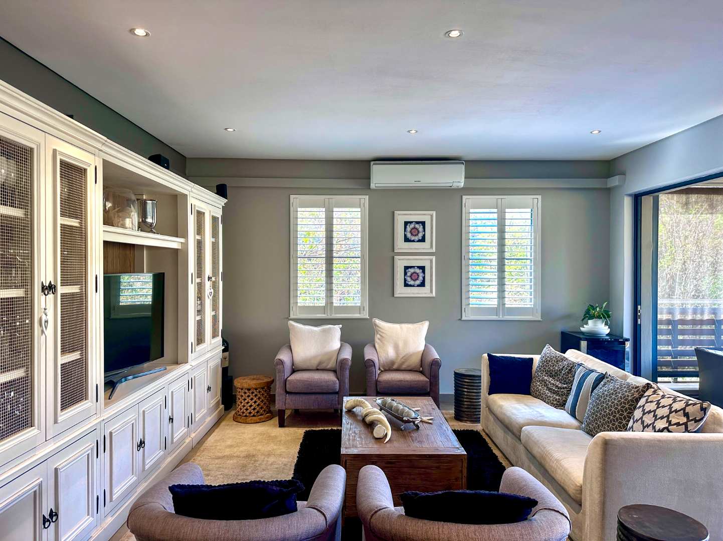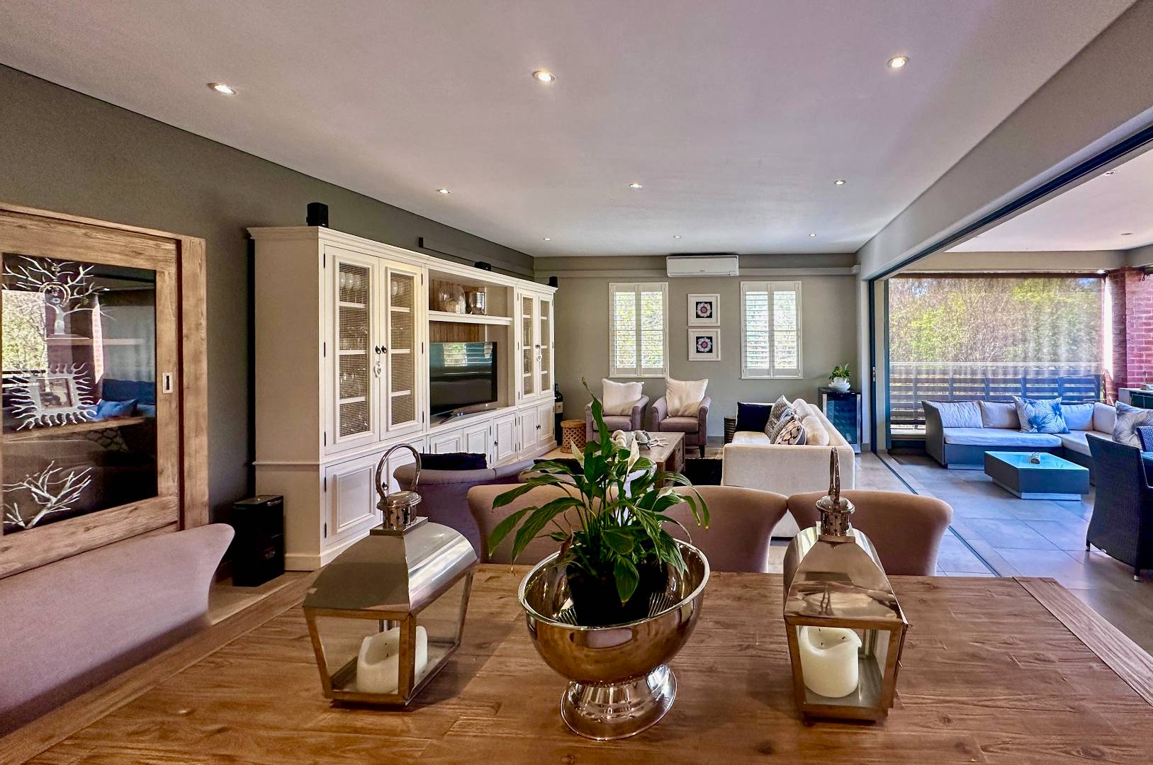 No need to measure for curtains as there are installed plantation shutters and privacy blinds on the huge patio.