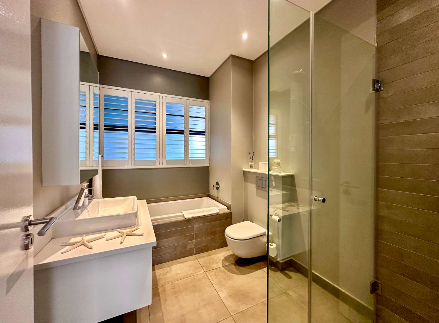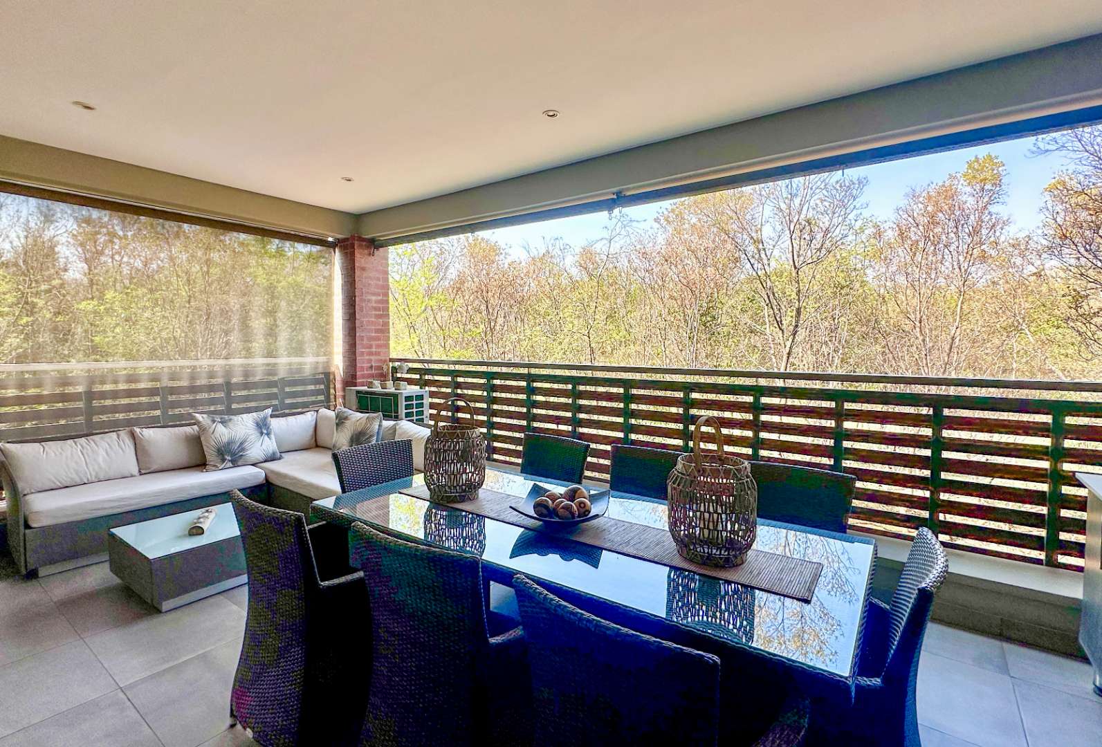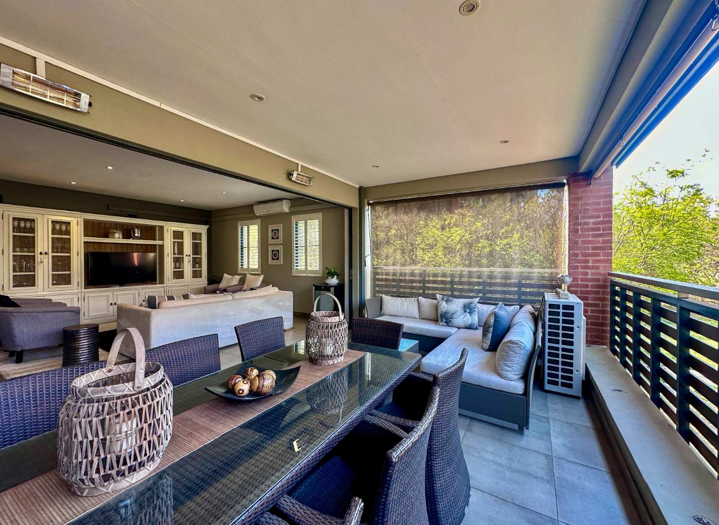 No need to measure for curtains as there are installed plantation shutters and privacy blinds on the huge patio.