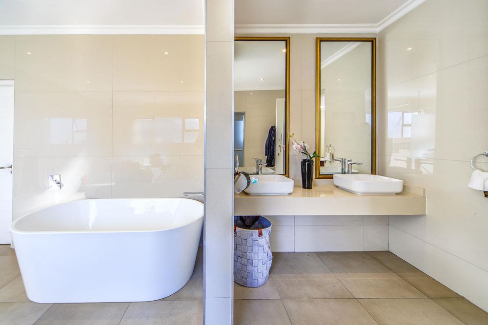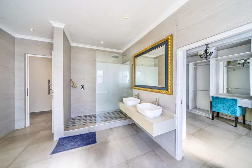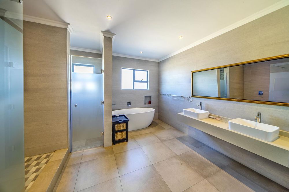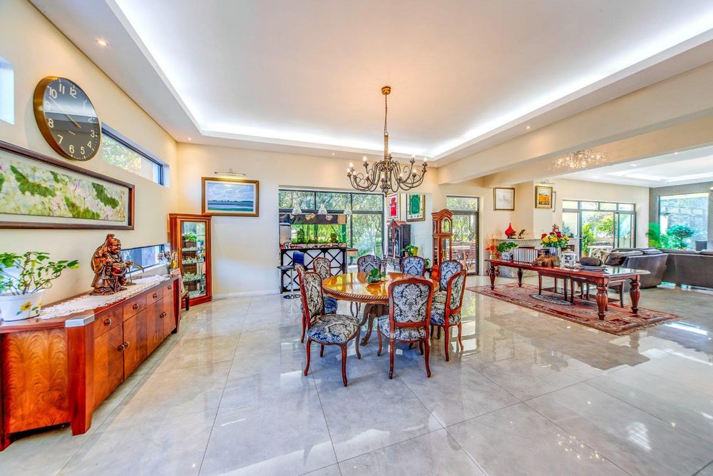 On the ground floor we enter through a grand entrance hall with triple volume ceilings leading into a spacious bar and entertainment area. Open plan dining and living areas with a stylish modern kitchen with integrated Siemens appliances boasting a sizeable dining island. Exquisite finishes accompanied by a storage room and space for a lift. Outdoor we have a large patio area with scenic views of the greenbelt. Guest room with bathroom situated downstairs. Ample lighting throughout the house.