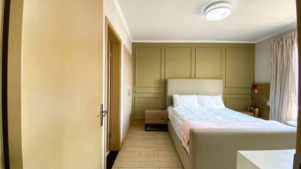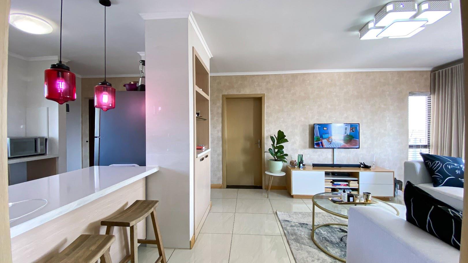 The contemporary kitchen is the heart of the home, showcasing white stone countertops, an electric glass hob, and oven, with space for two under-counter appliances and a double-door fridge. The open-plan lounge and dining area is bright and inviting, finished with polished porcelain tiles and stylish wallpaper accents—perfect for modern living.