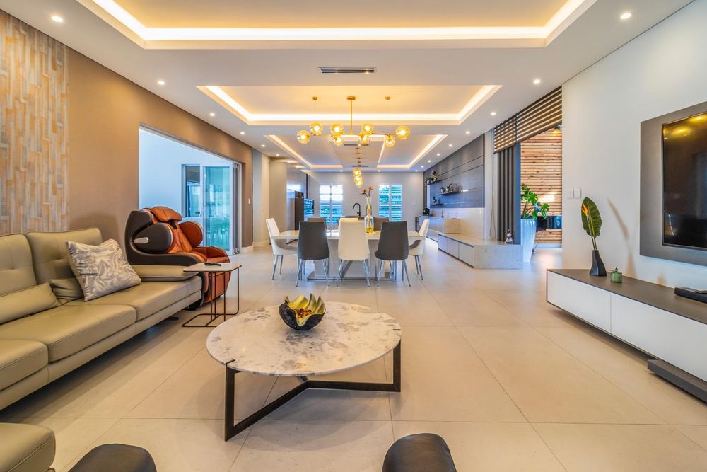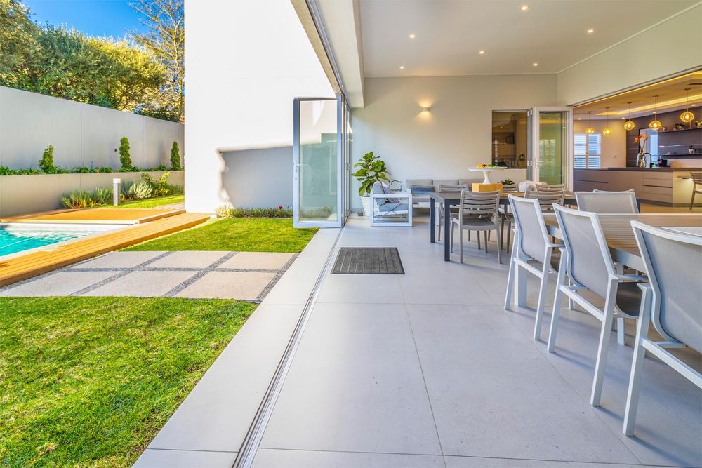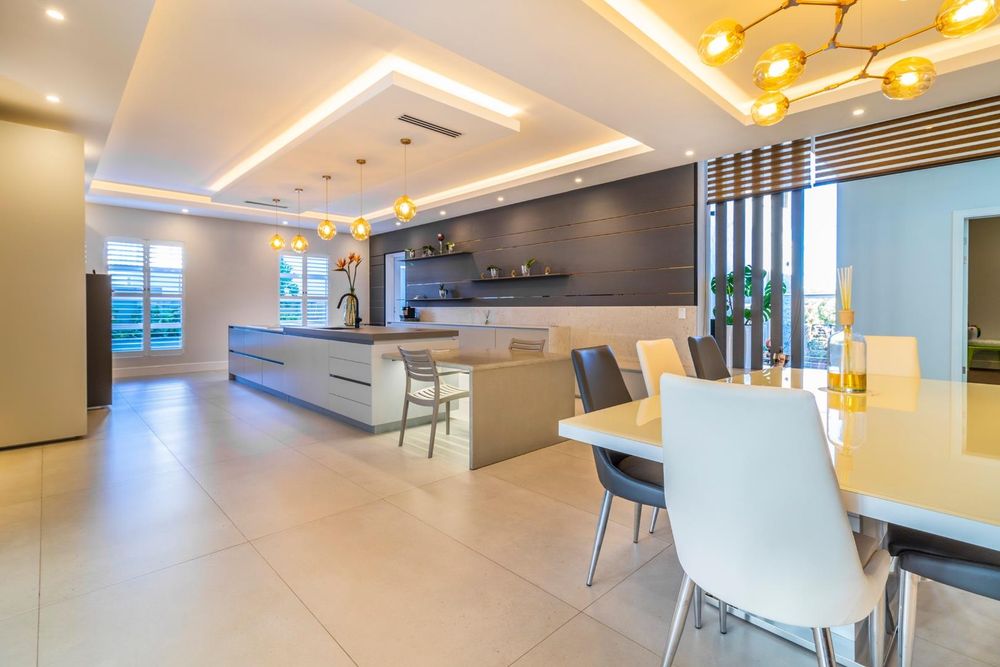 The open-plan dining area seamlessly flows into the outside enclosed patio, blurring the boundaries between indoor and outdoor living. Underfloor heating, powered by a water-based heat pump, ensures comfort on cooler days, while integrated split air conditioning provides optimal climate control throughout the home.