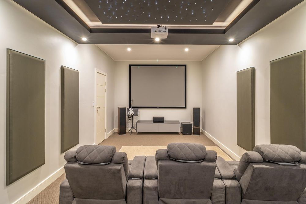 Entertainment reaches new heights in the home theater, complete with a high-definition projector and star lights that create a mesmerizing ambiance. The Blue Line kitchen is a culinary masterpiece, featuring top-of-the-line Miele appliances, including a built-in fridge freezer, ovens, microwave, coffee machine, steamer, electric cooktop, and a pop-up extractor. Pop-up plugs with USB ports seamlessly integrate modern convenience into the space.