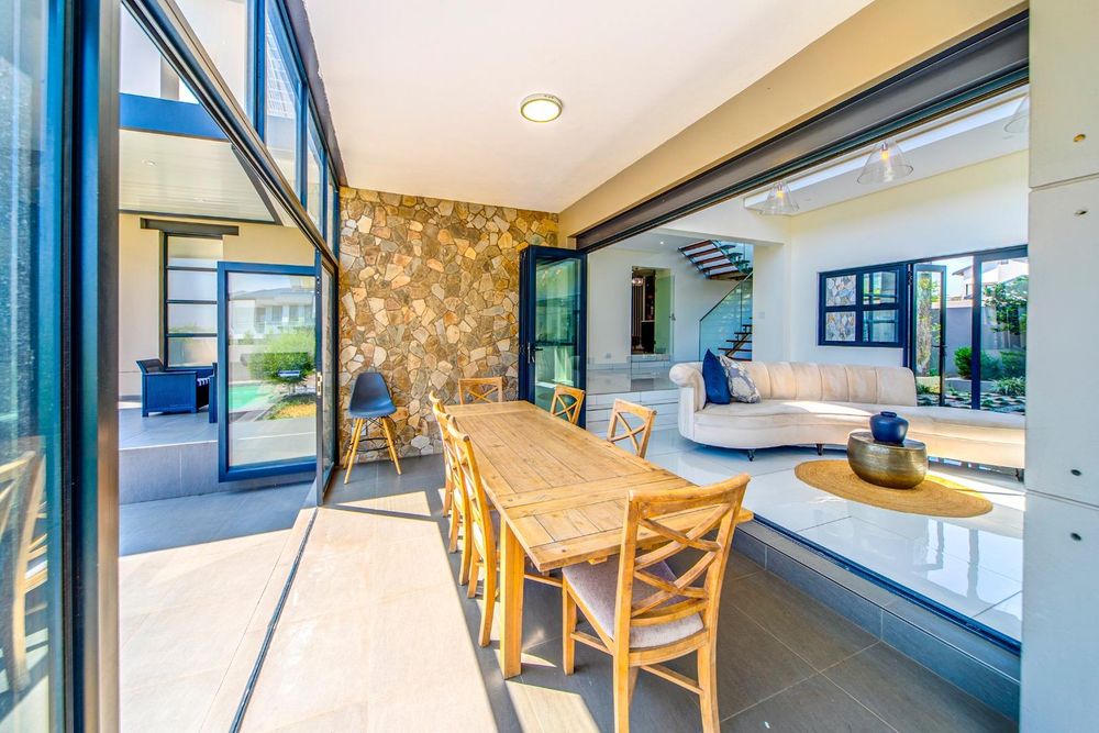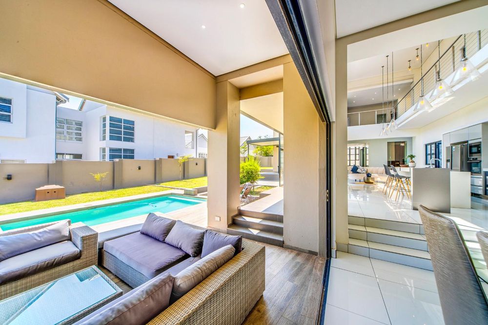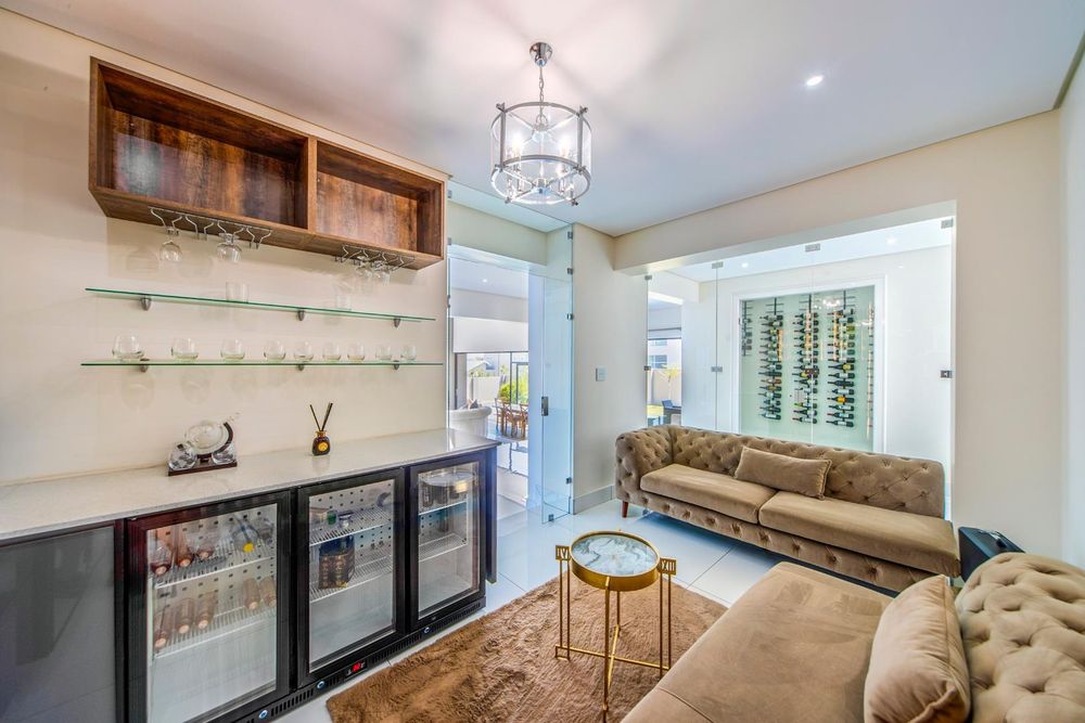 The heart of the home beats with elegance in the wine cellar, where your most treasured vintages await their moment. An enclosed bar area and formal lounge provide perfect settings for entertaining, while the open-plan kitchen boasts state-of-the-art AEG appliances, a separate scullery, and a gas fireplace that adds warmth to every meal. The dining room and TV lounge flow seamlessly from the kitchen, with stack doors opening to a covered patio. Here, a built-in braai and sink overlook the serene pool and boma area, inviting endless days of relaxation and entertainment under the African sky.
