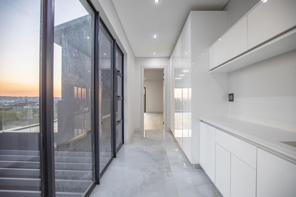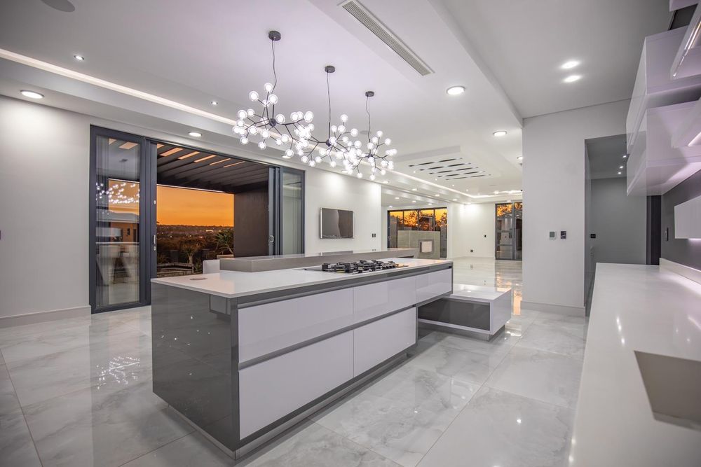 The open-plan kitchen is a true masterpiece, seamlessly blending style and functionality. It is equipped with integrated state-of-the-art appliances, including a coffee machine, microwave, steam oven, warming drawers, a pop-up extractor, and soft-close cabinetry. A secondary stove in the scullery further enhances practicality. This space flows effortlessly into the dining area, family room, and an additional lounge, culminating in an enclosed patio fitted with a built-in gas braai and its own extractor—perfect for entertaining guests in comfort and style.