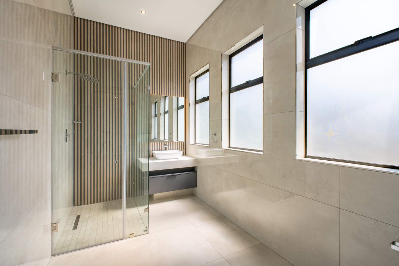 A guest bathroom with shower doubles as a stylish bathroom for the generous downstairs bedroom, making it ideal for visitors or extended family.