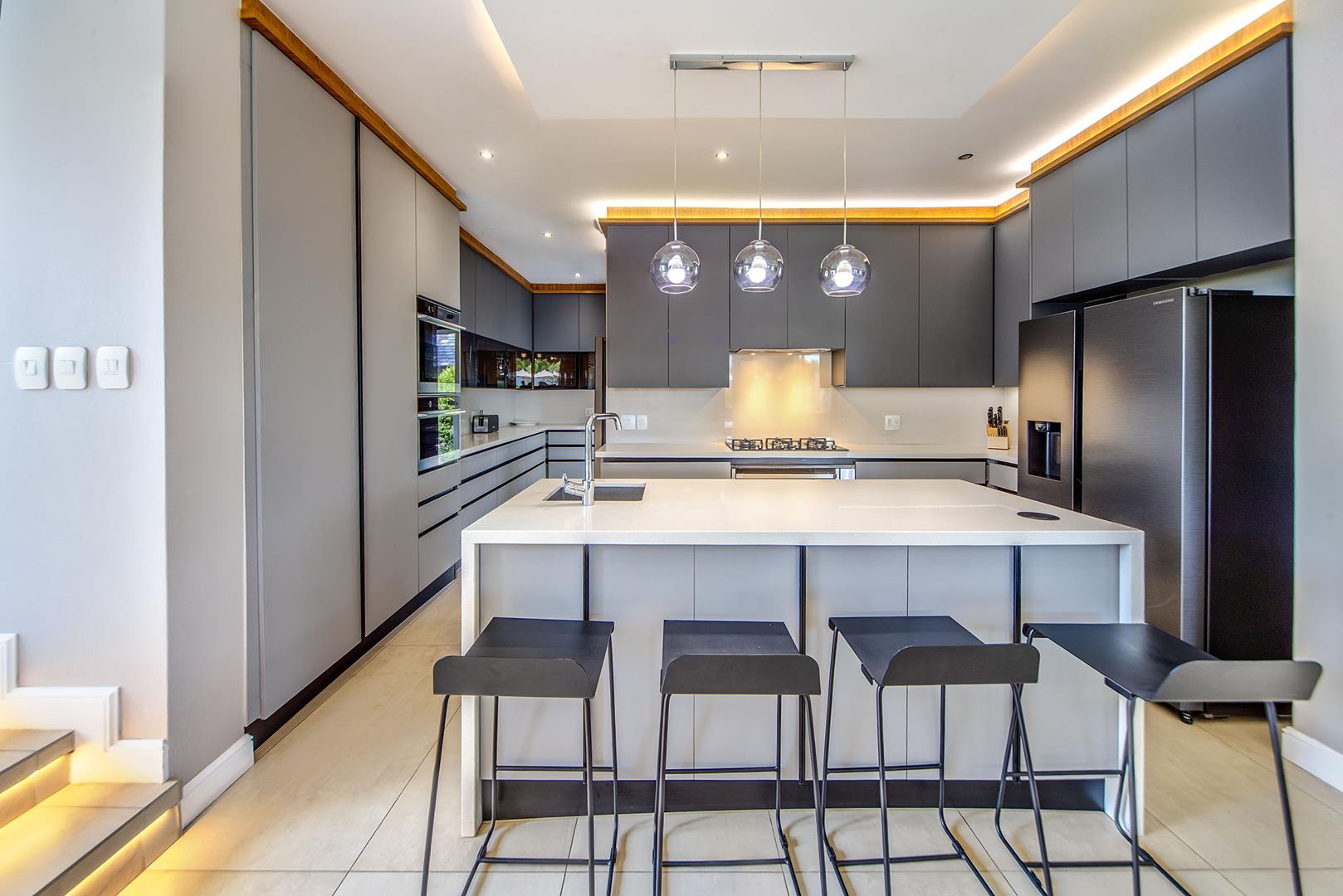 To your left of your entrance, a refined formal lounge provides an elegant space for entertaining, flowing seamlessly into the dining area on your right and onward to a sleek, modern kitchen fitted with a built-in electric oven as well as a microwave, gas stove and gas oven, and separate scullery for effortless functionality.