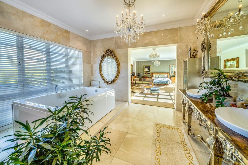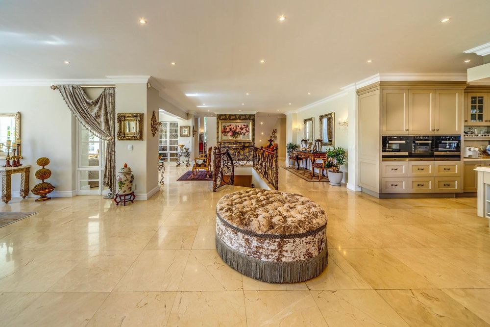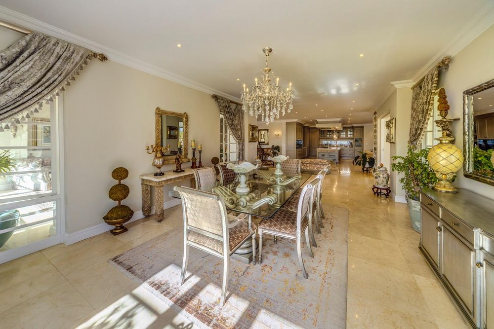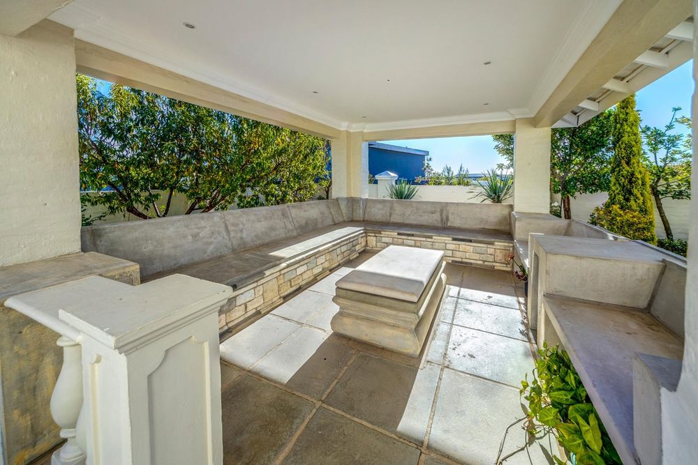 A covered patio with a built-in gas braai opens to the outdoor area, making it perfect for alfresco dining and entertaining. The TV lounge, featuring a wood fireplace, offers a warm and inviting space for family relaxation. The open-plan kitchen is equipped with top-of-the-line Miele appliances, a gas stove, integrated fridge, and freezer. A separate scullery with a pantry, along with a separate laundry room and store room, add to the home's functionality and convenience.