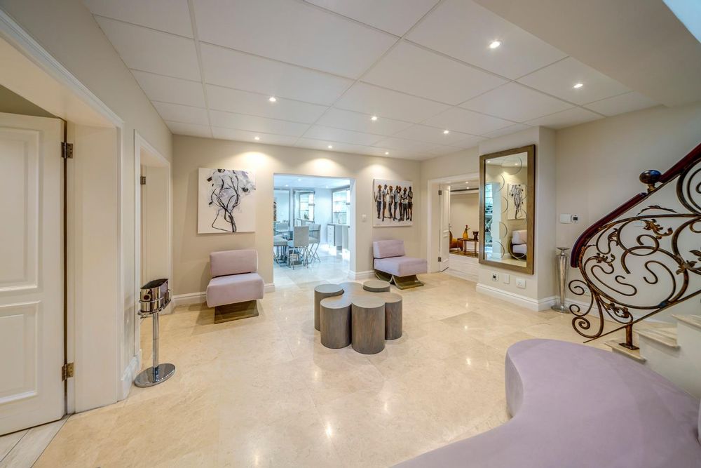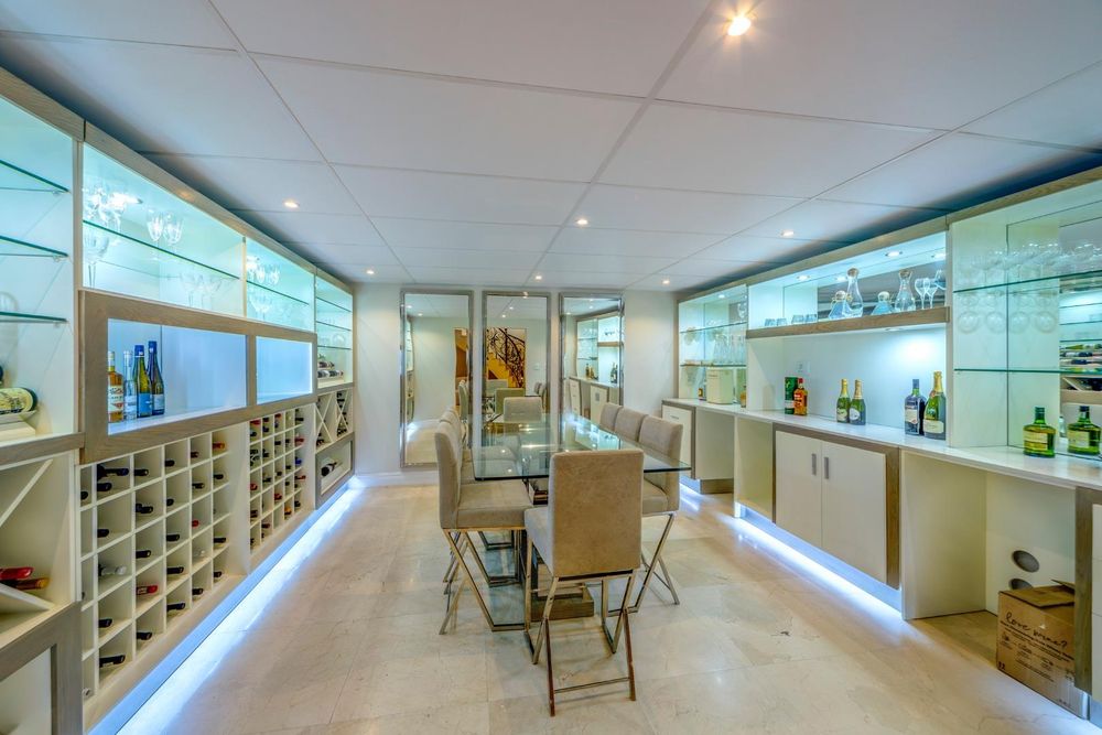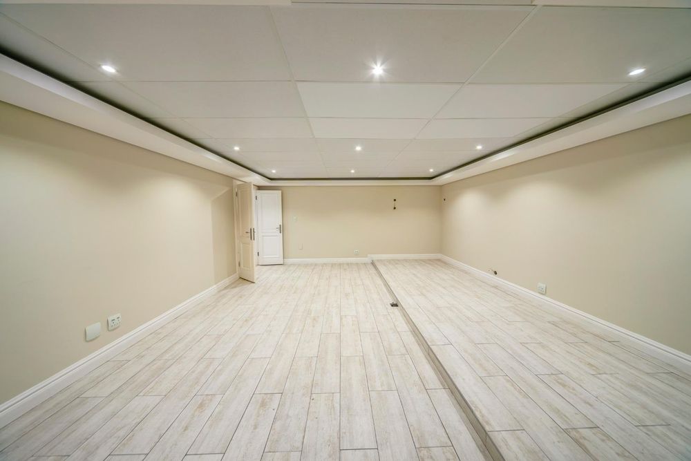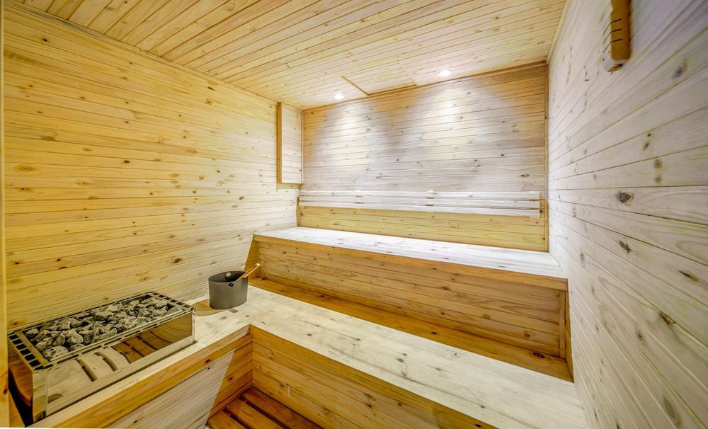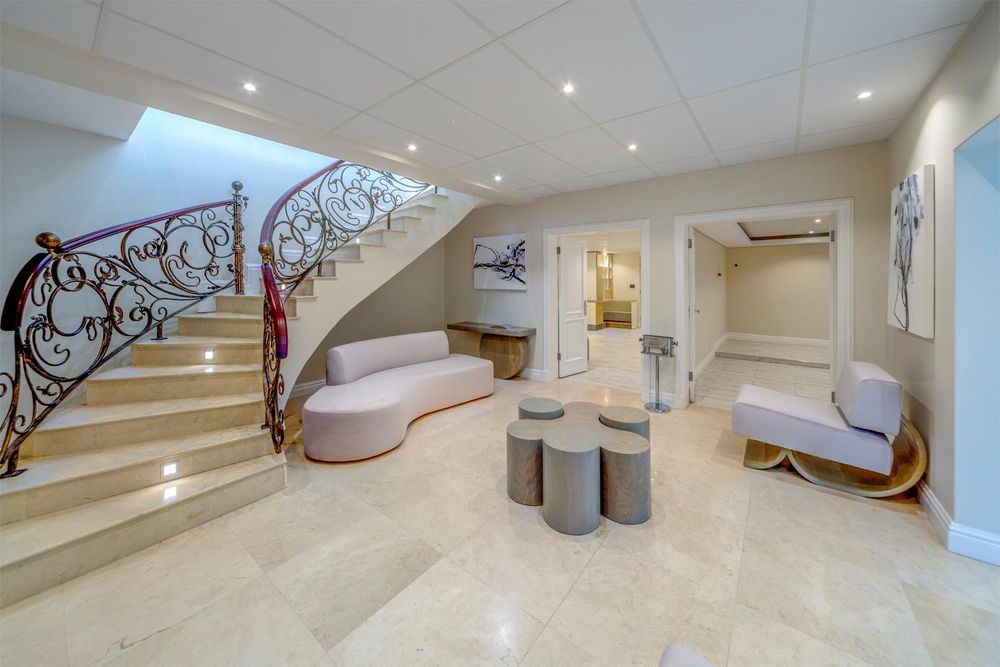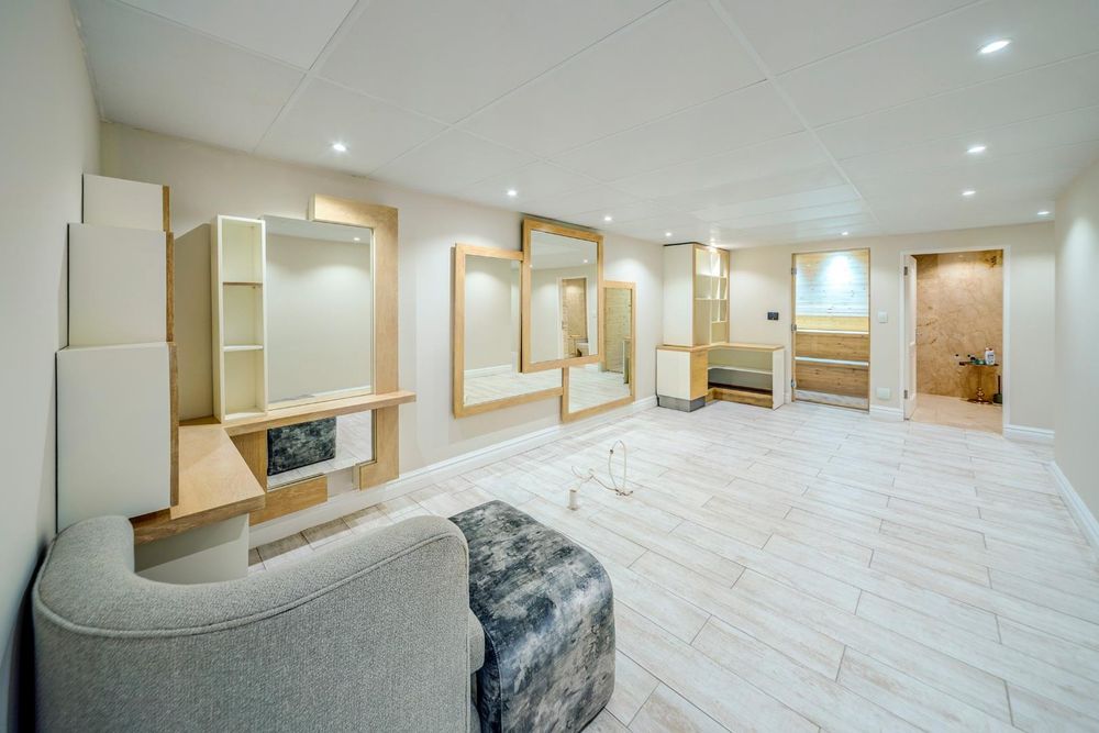 The basement level offers a variety of amenities, including a wellness room with a sauna, steam shower, and space for a gym. There's also a versatile room that can be used as a cinema, a bar area, and an entertainment space.