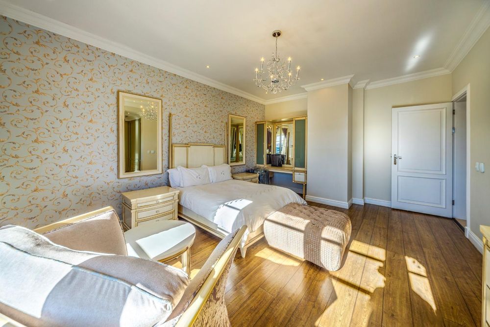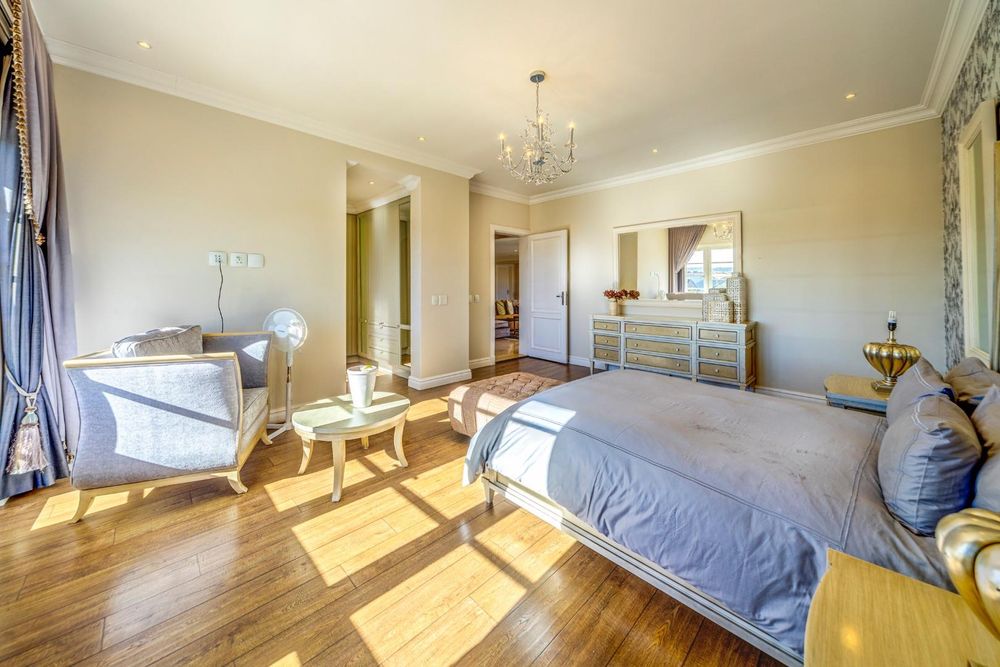 The low-maintenance garden includes a pleasant outdoor sitting area and a pool, complemented by 15,000-liter water tanks for irrigation. Additional outdoor features include an outside toilet, three garages on one side and two on the other, both with direct access to the house. The home is equipped with an inverter for energy efficiency and a spacious staff room with an en suite bathroom and kitchenette.