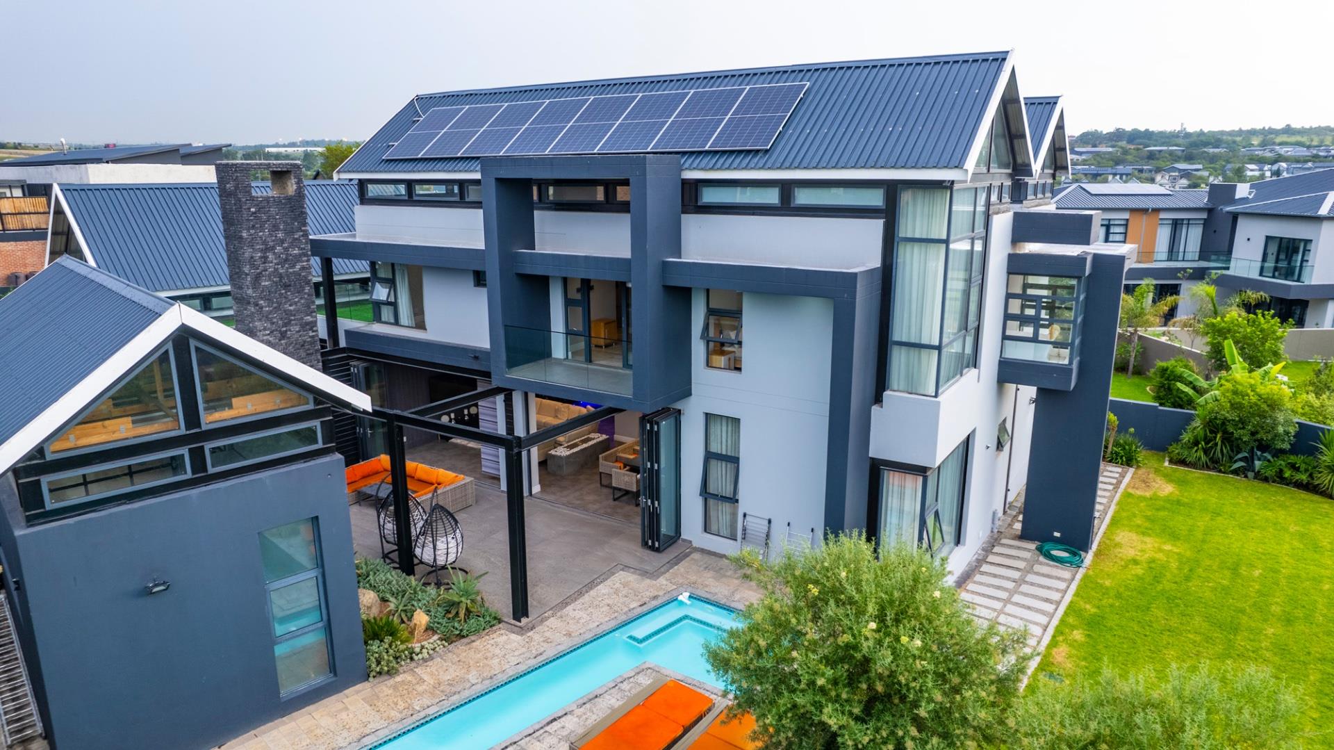 The ground floor houses two well-appointed bedrooms that share a Jack and Jill bathroom with a shower. Step outside to discover an outdoor oasis with a built-in braai, perfect for alfresco dining. The stack doors effortlessly open to reveal an expansive entertainment area, complete with a built-in braai, a sizable pool, and a lush garden. A downstairs study provides a serene workspace.