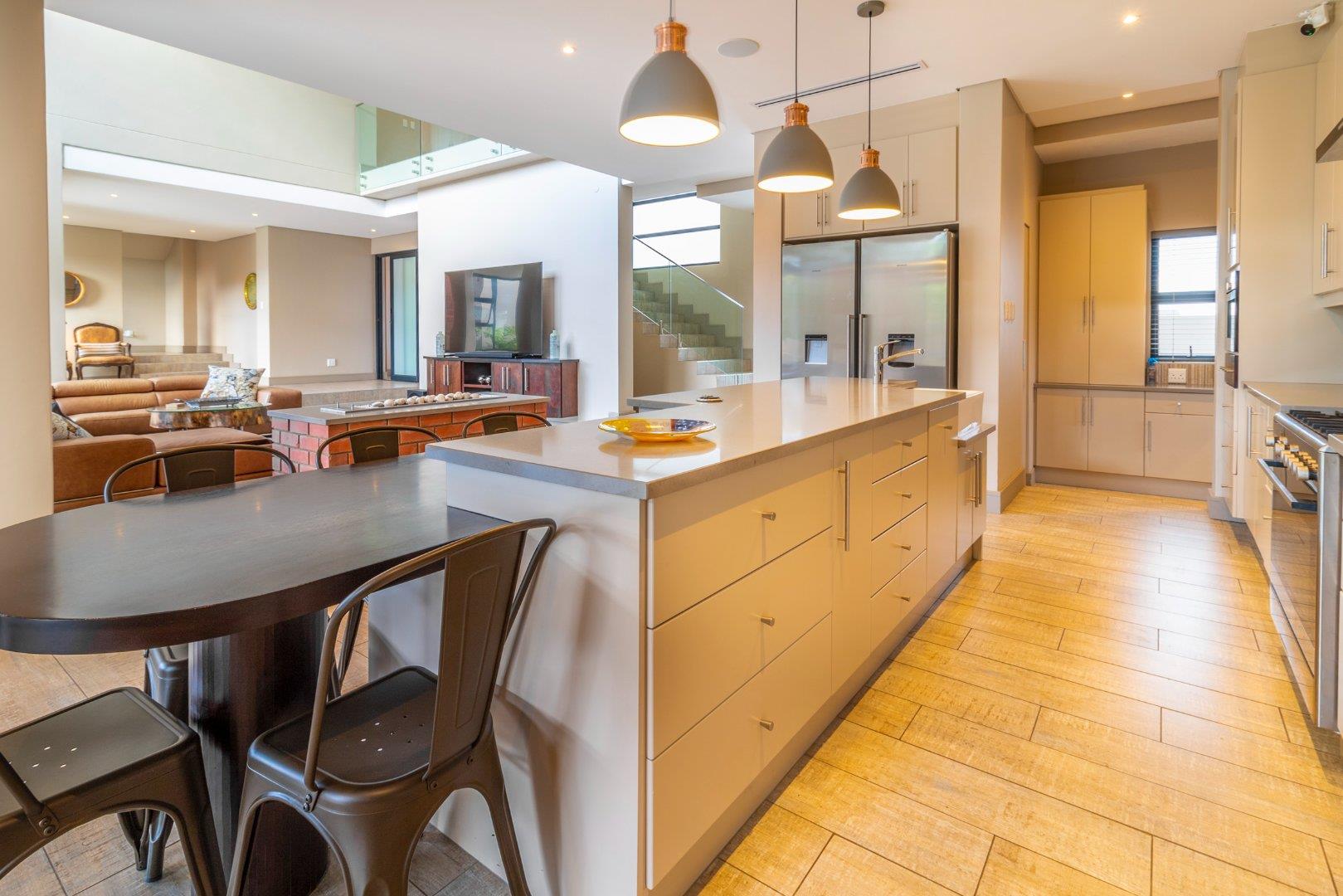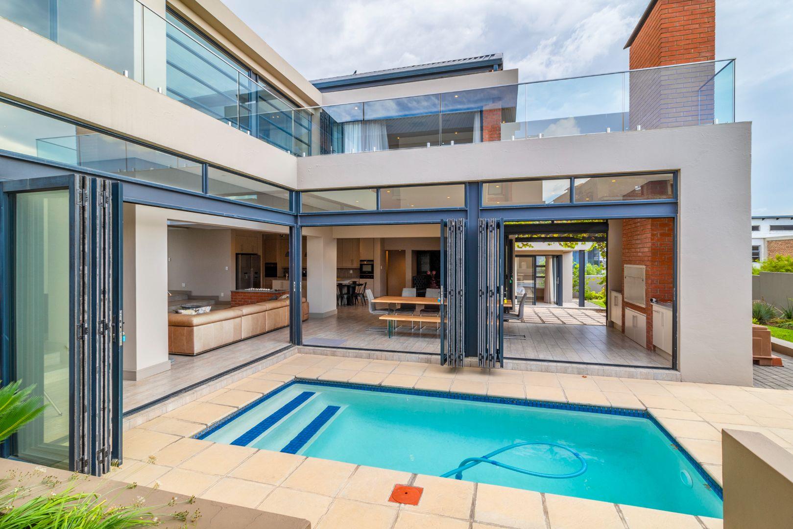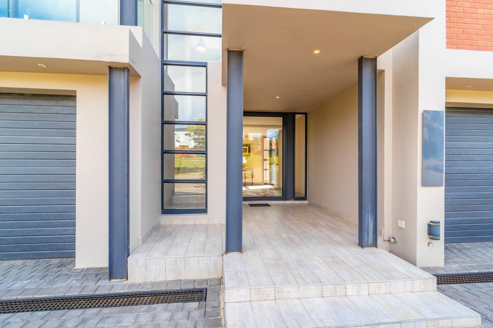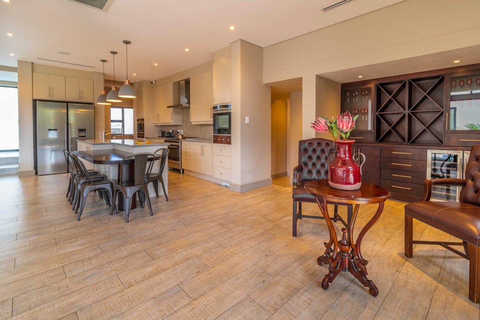 This contemporary home, built in 2019, offers 689 sqm of luxury living on a 1,097 sqm stand. The property features home automation, security cameras, intercom, fibre with server room, inverter with 3 solar panels, solar geyser, central vacuum, and central air-conditioning downstairs.