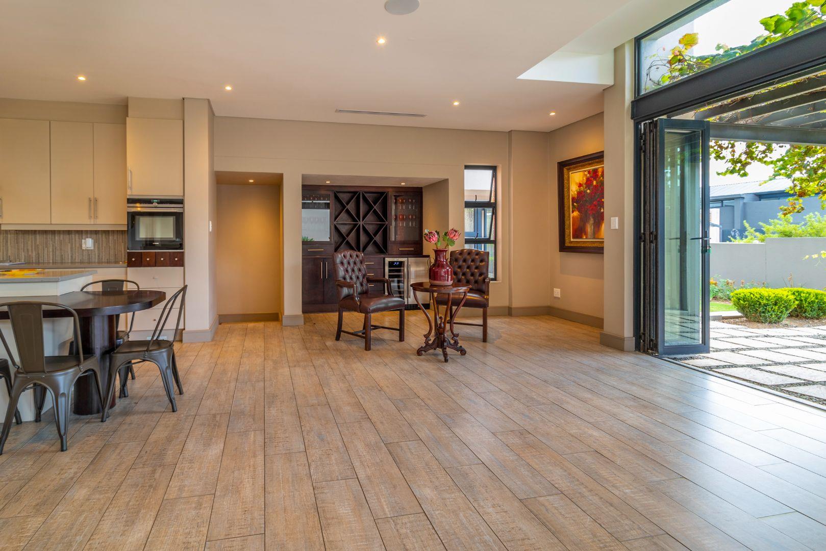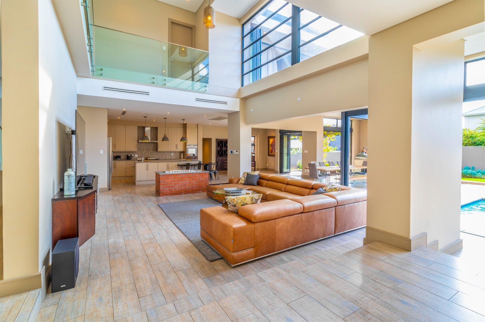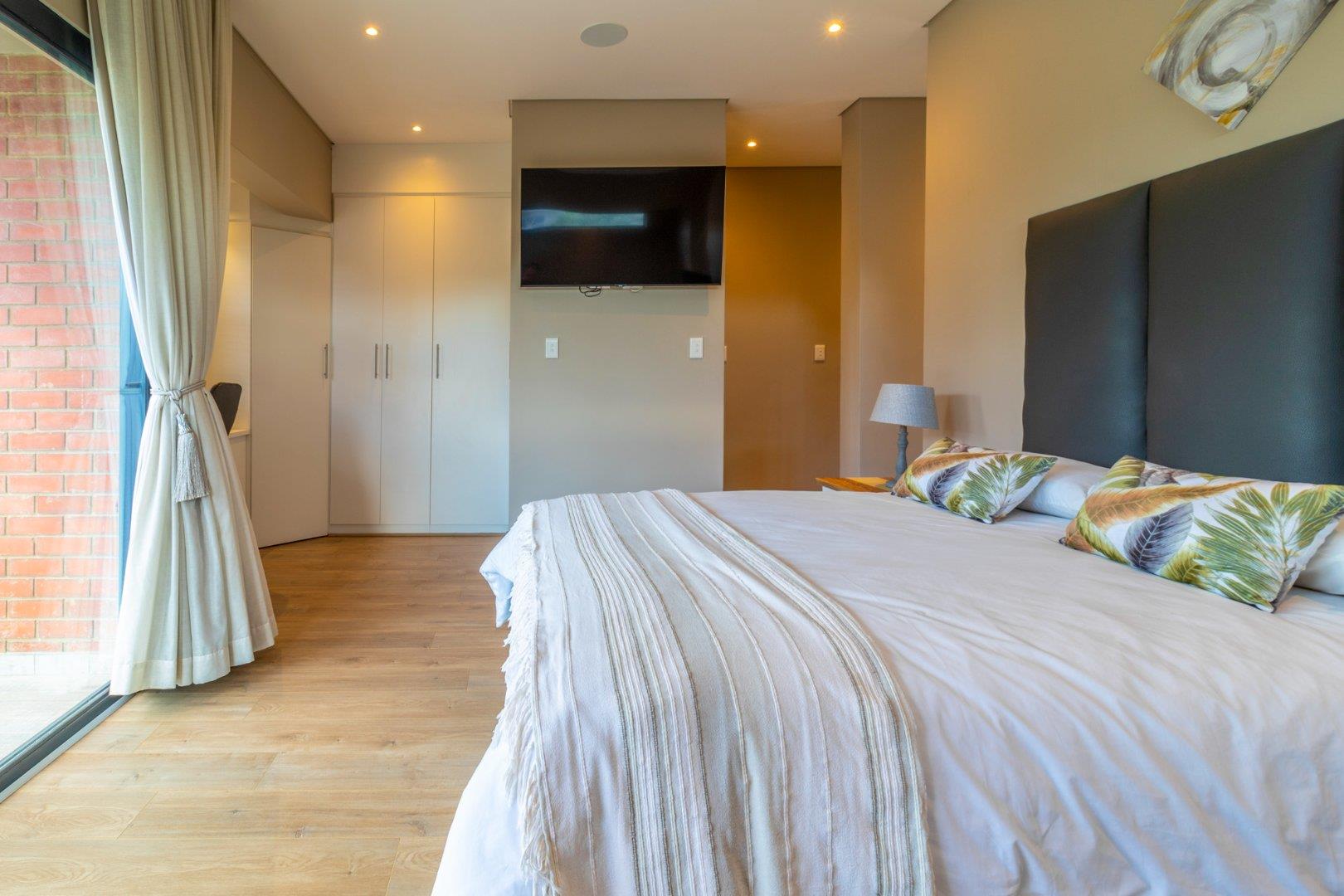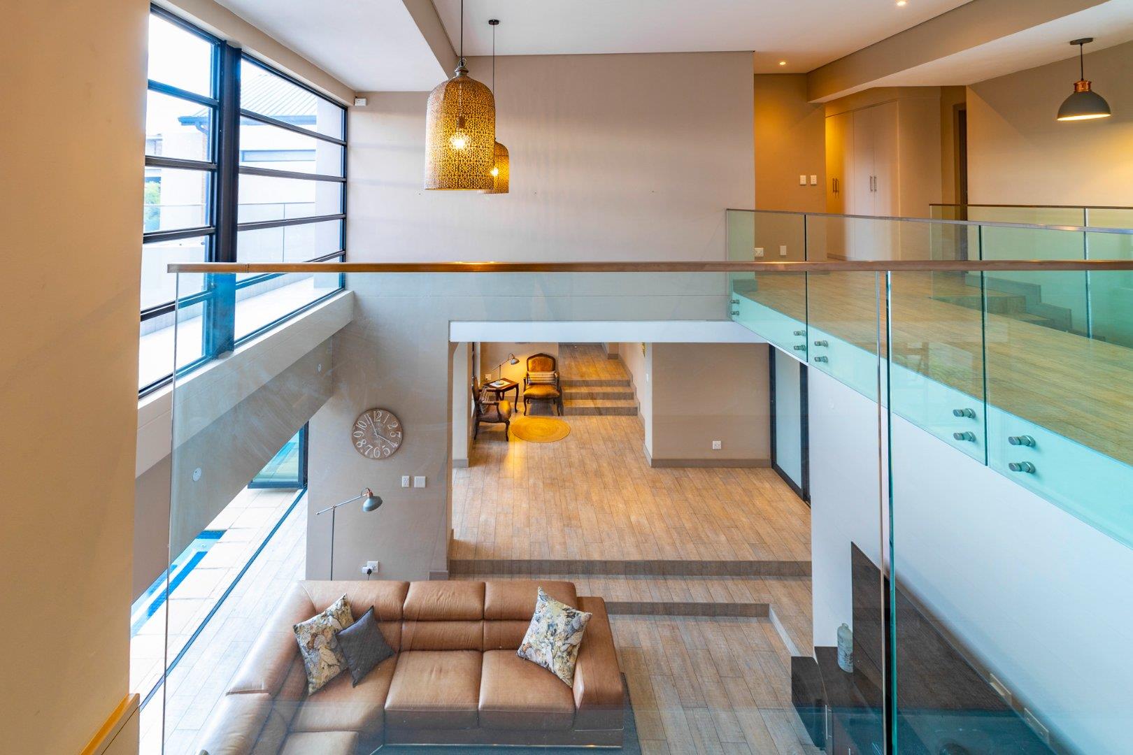 This contemporary home, built in 2019, offers 689 sqm of luxury living on a 1,097 sqm stand. The property features home automation, security cameras, intercom, fibre with server room, inverter with 3 solar panels, solar geyser, central vacuum, and central air-conditioning downstairs.