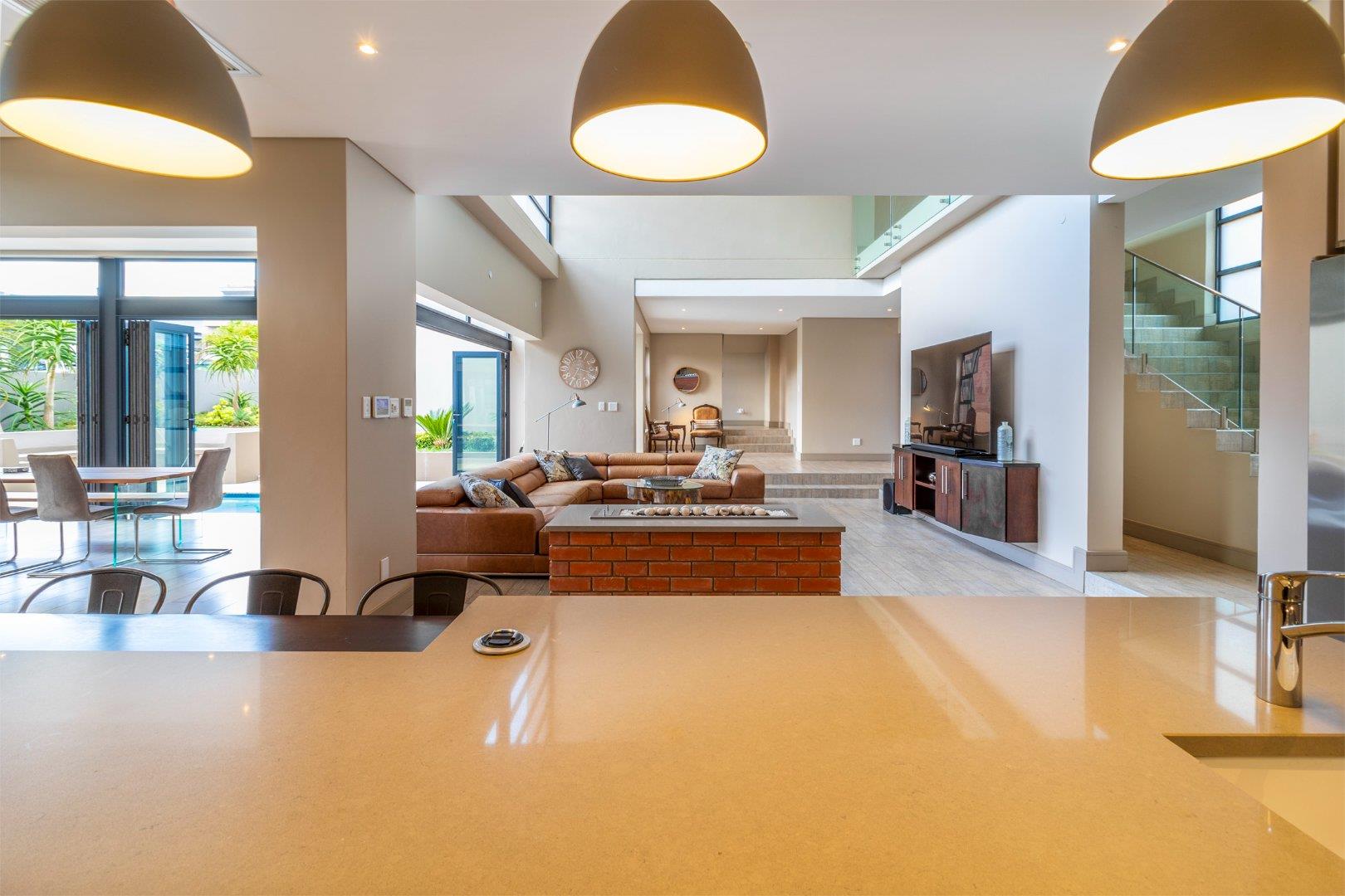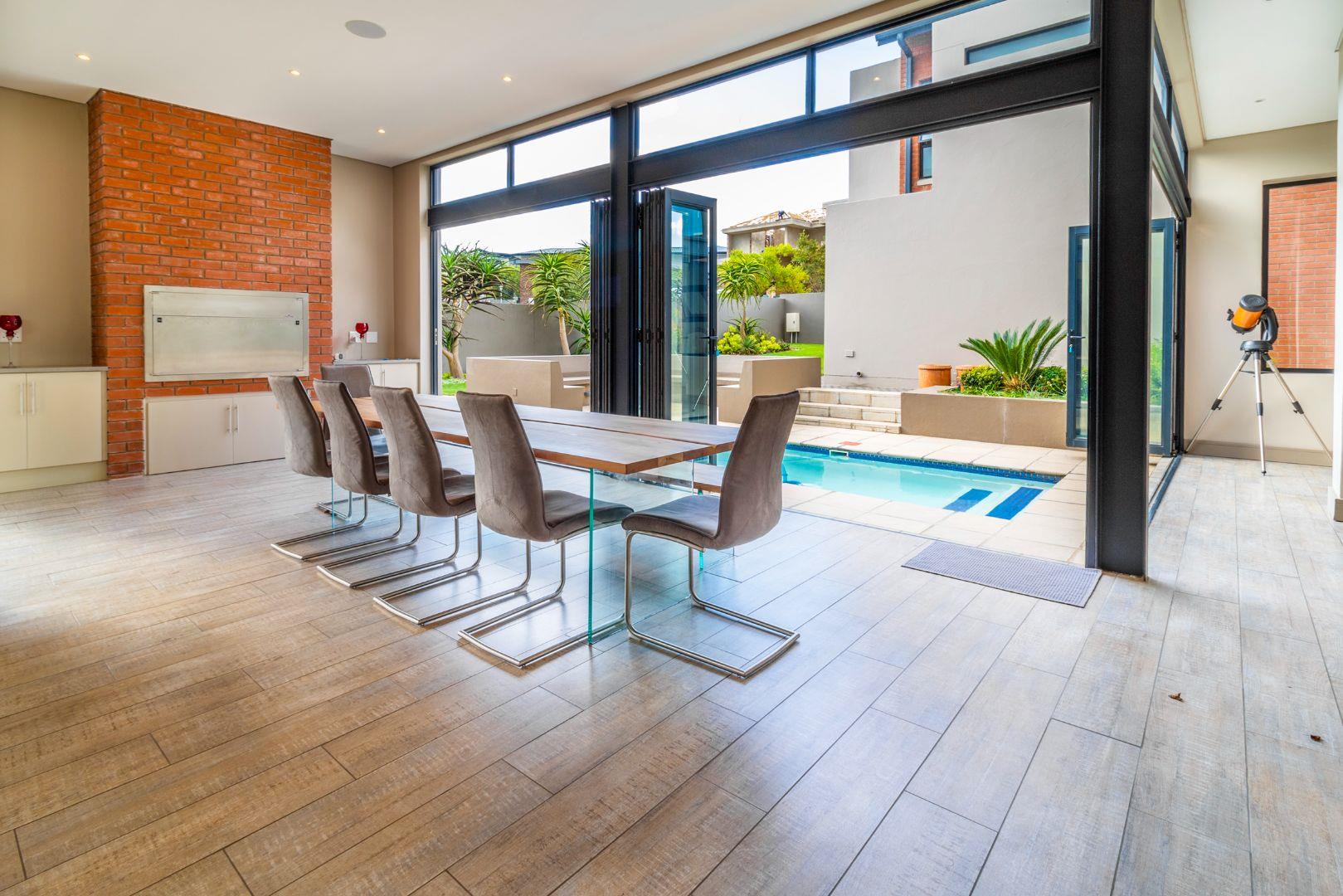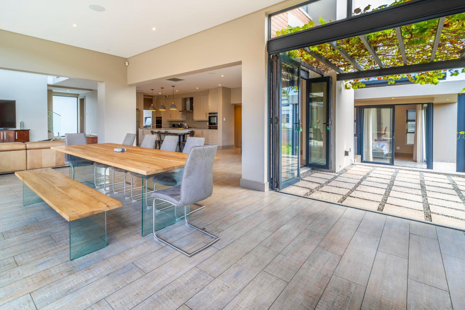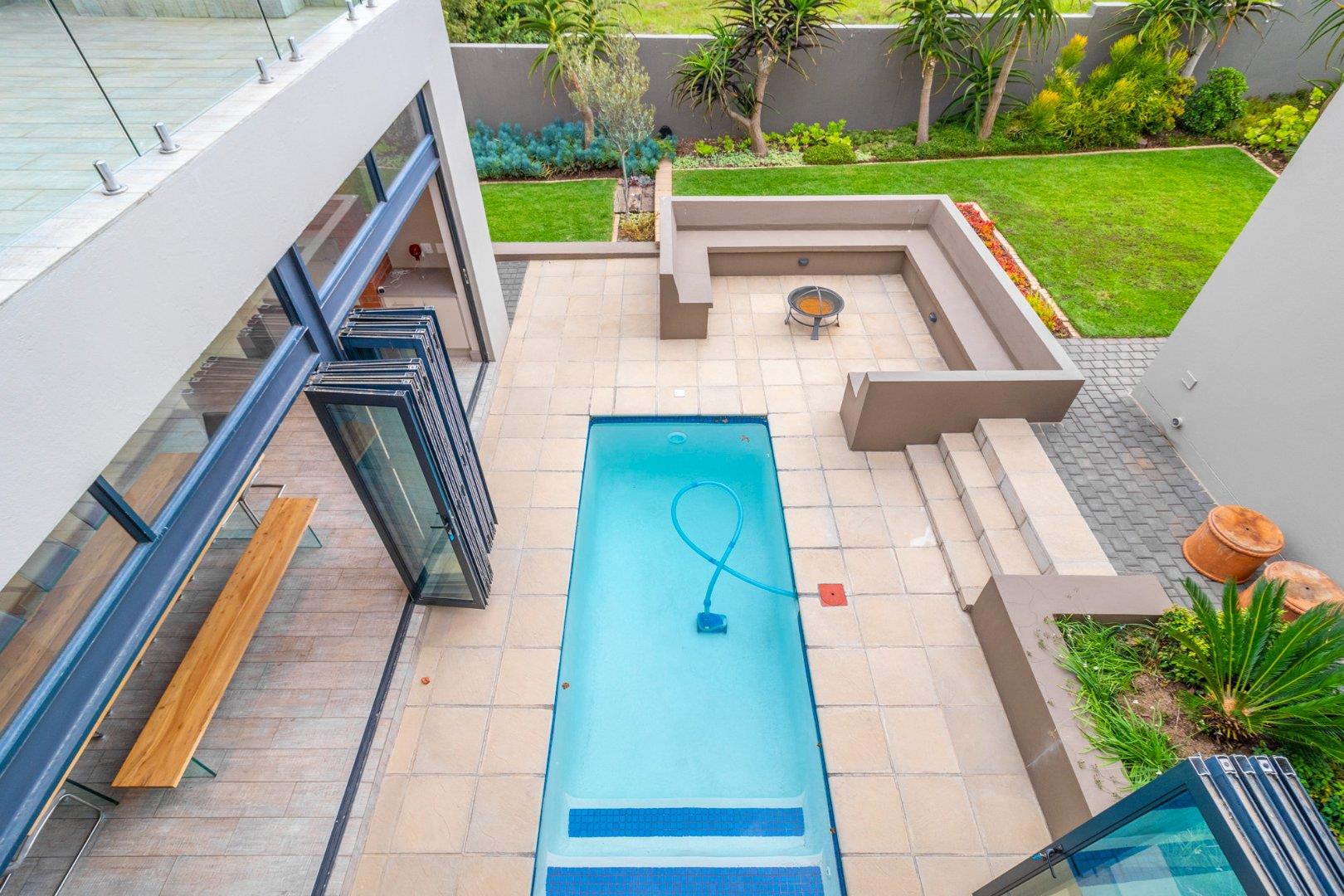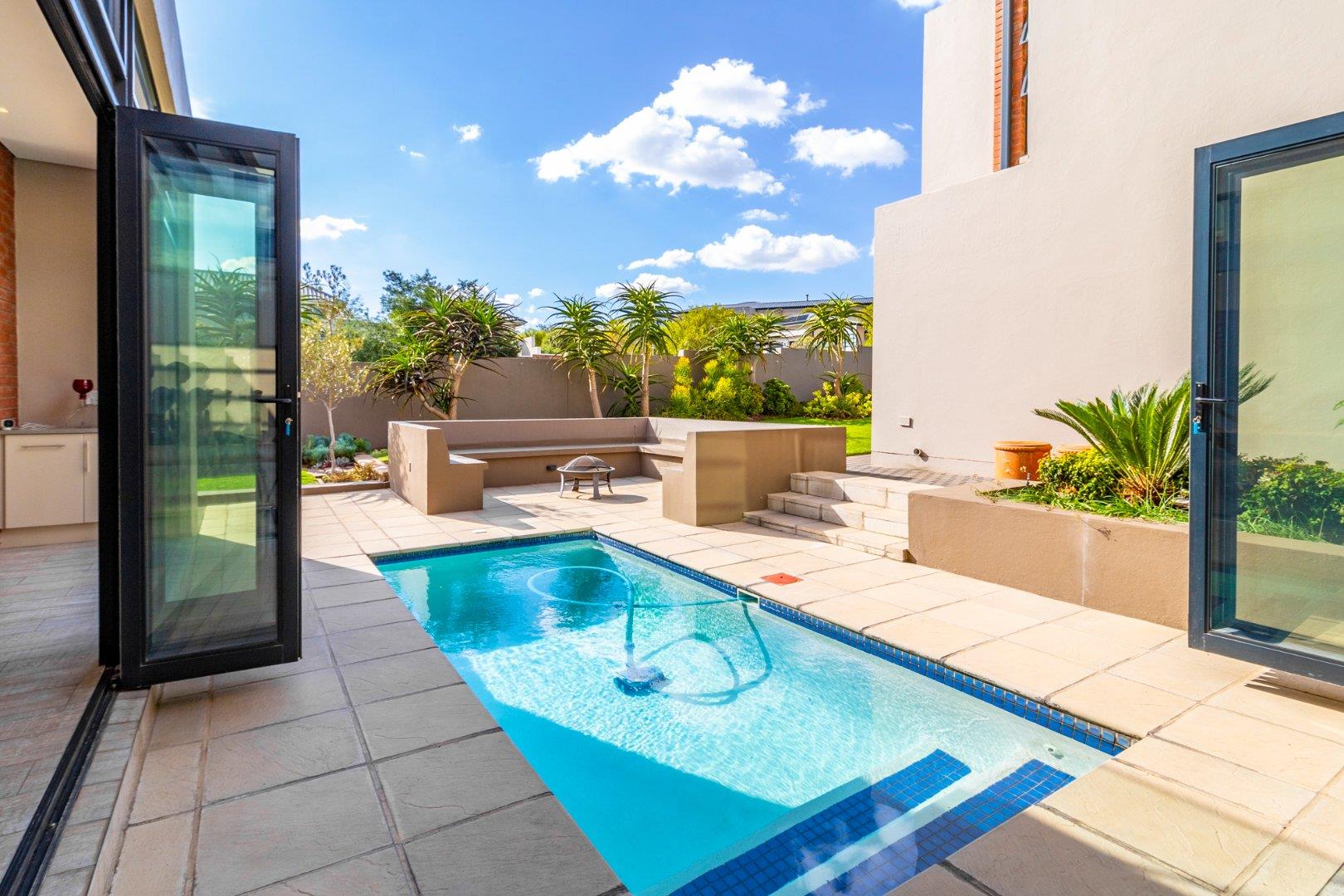 The modern kitchen includes a pantry, bar area, built-in Siemens coffee machine, and fridge with water connection. Living areas open through folding doors to the pool, boma, gas braai, and entertainment area. Water-based underfloor heating with heat pump adds extra comfort.