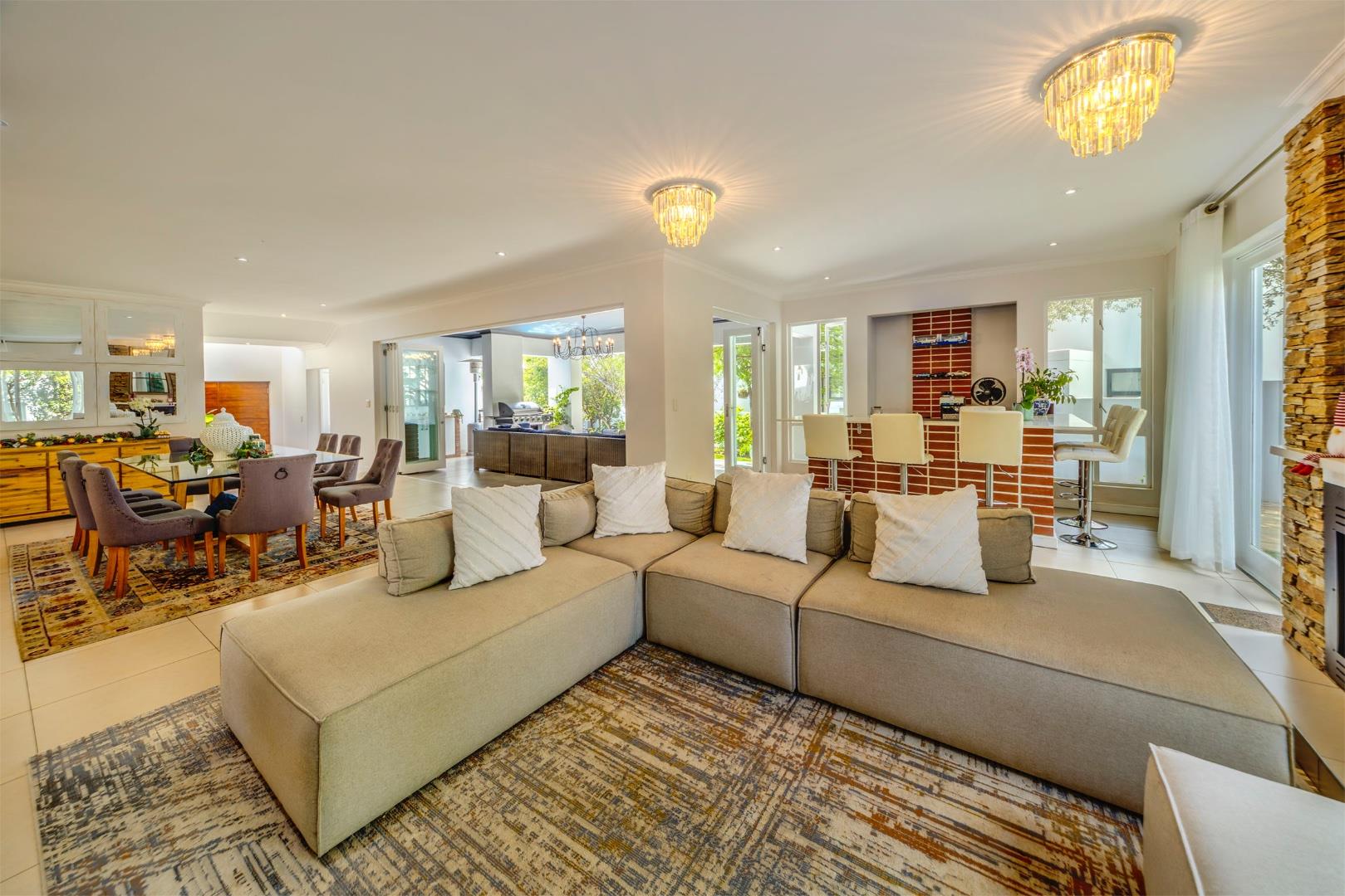 A bar area and a spacious lounge create the perfect setting for relaxation and socialising. Stacking doors lead out to an expansive patio overlooking a landscaped garden, a sparkling pool, and a heated jacuzzi complete with a tranquil water feature, making outdoor living a dream.