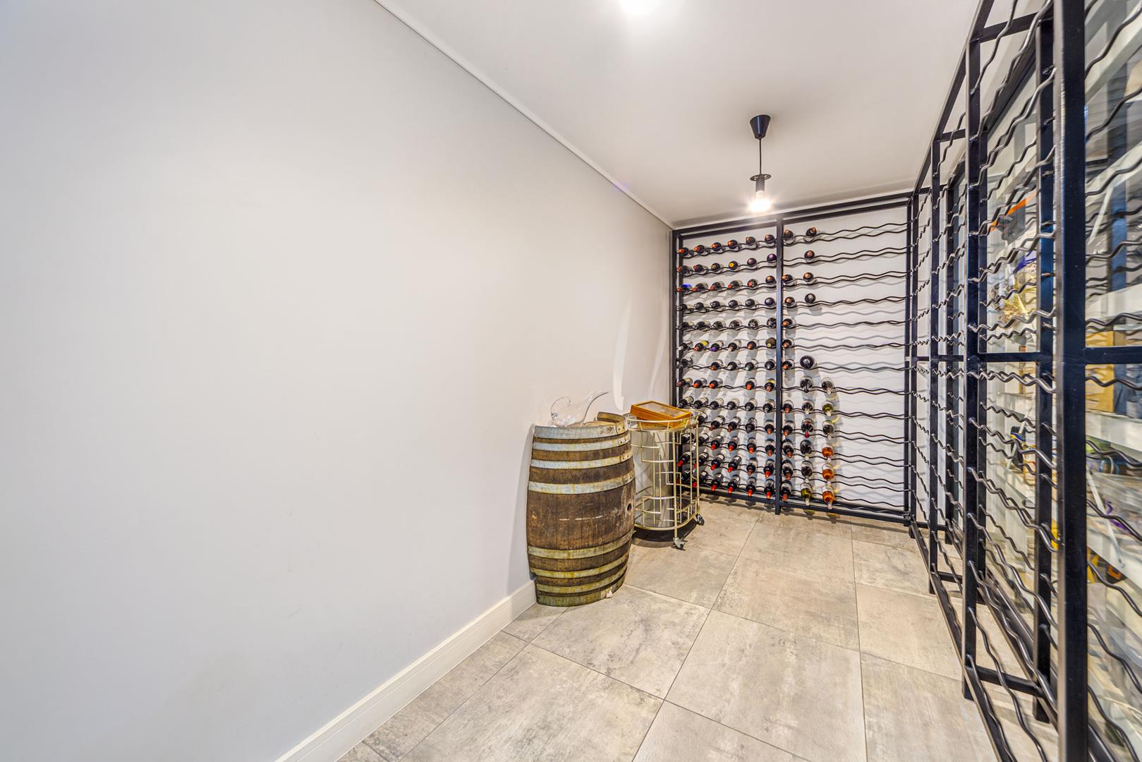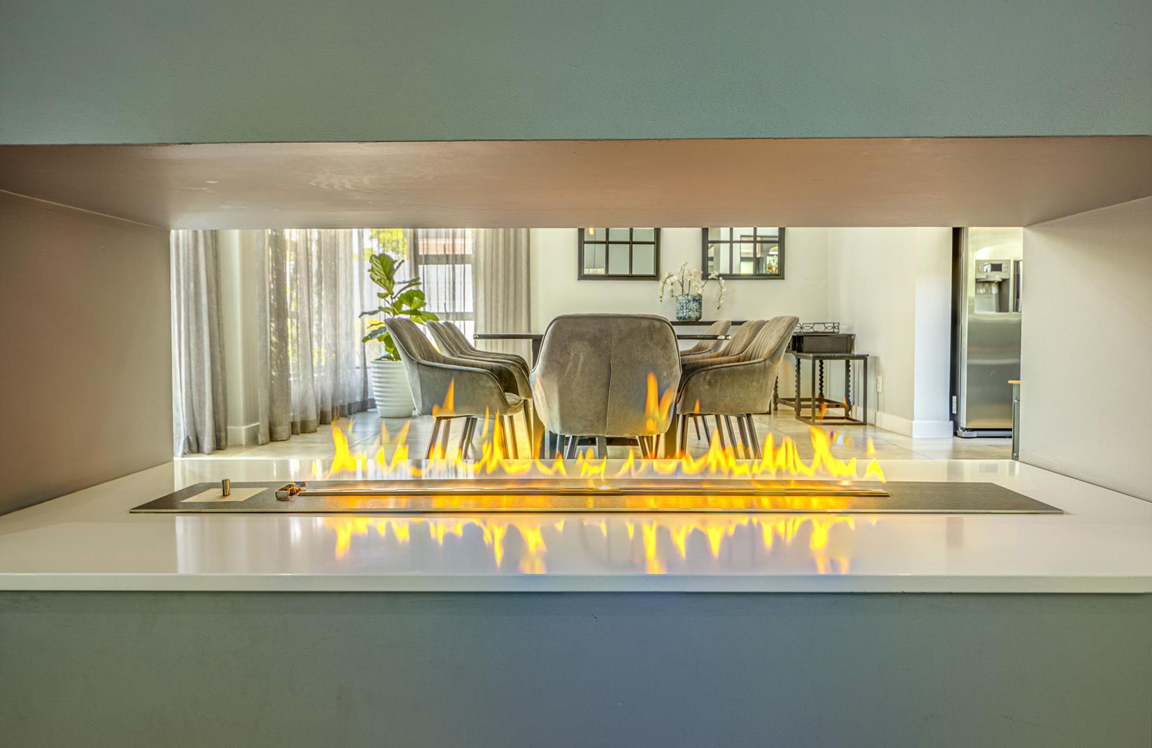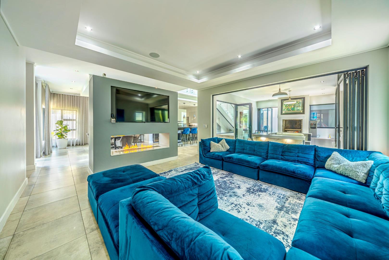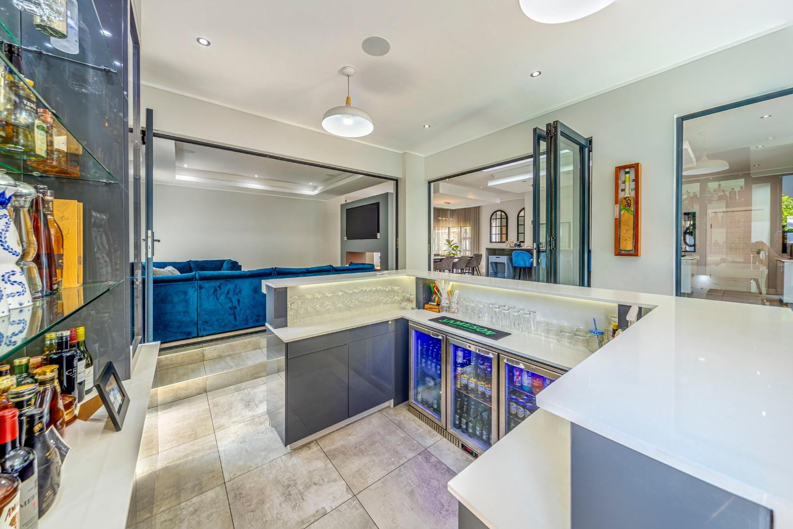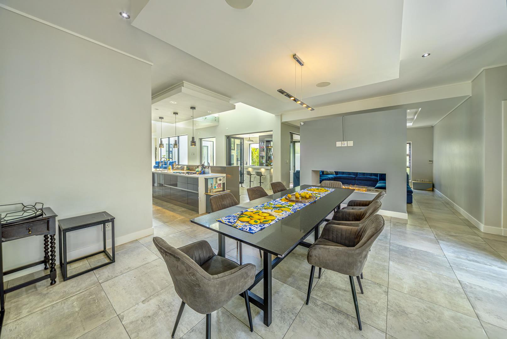 Adjacent to the kitchen, the dining area which is separated by a cozy gas fireplace into a comfortable TV lounge equipped with air conditioning. Expansive stack doors open to a sophisticated bar area with a built-in braai and bar, perfect for entertaining.