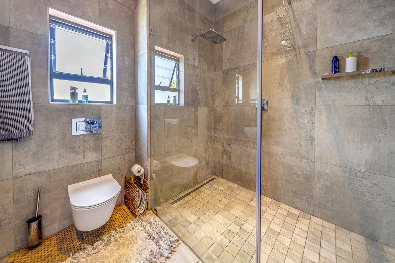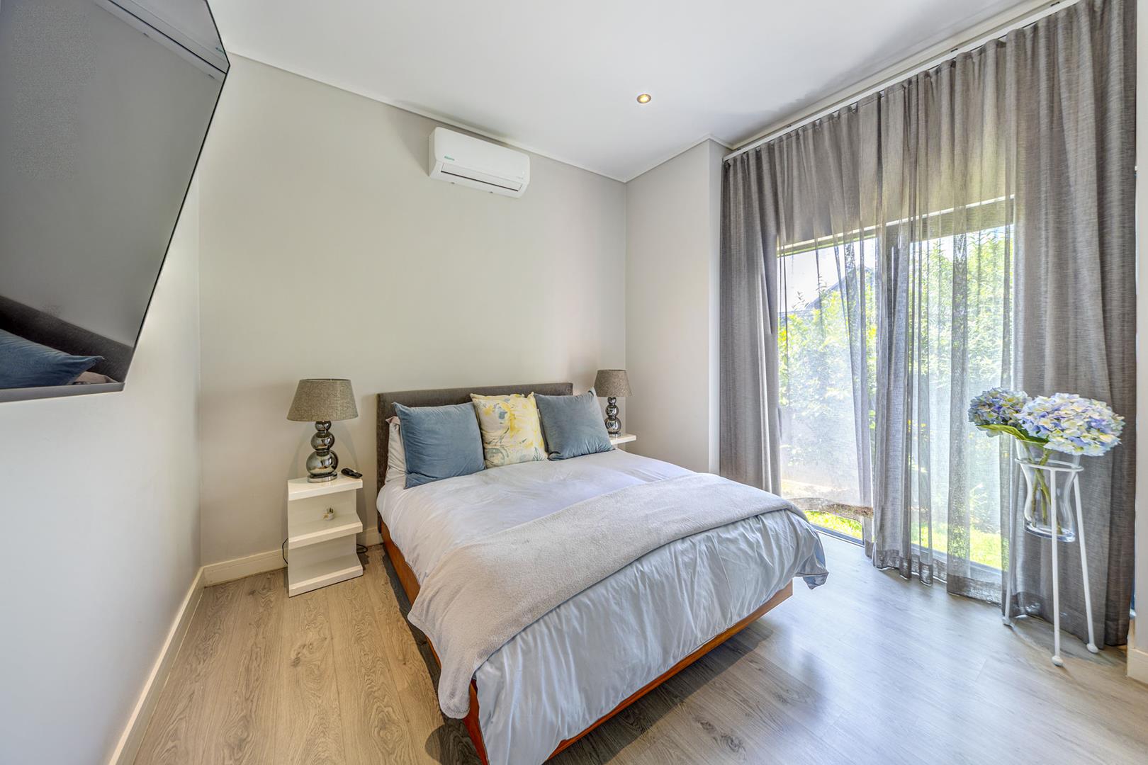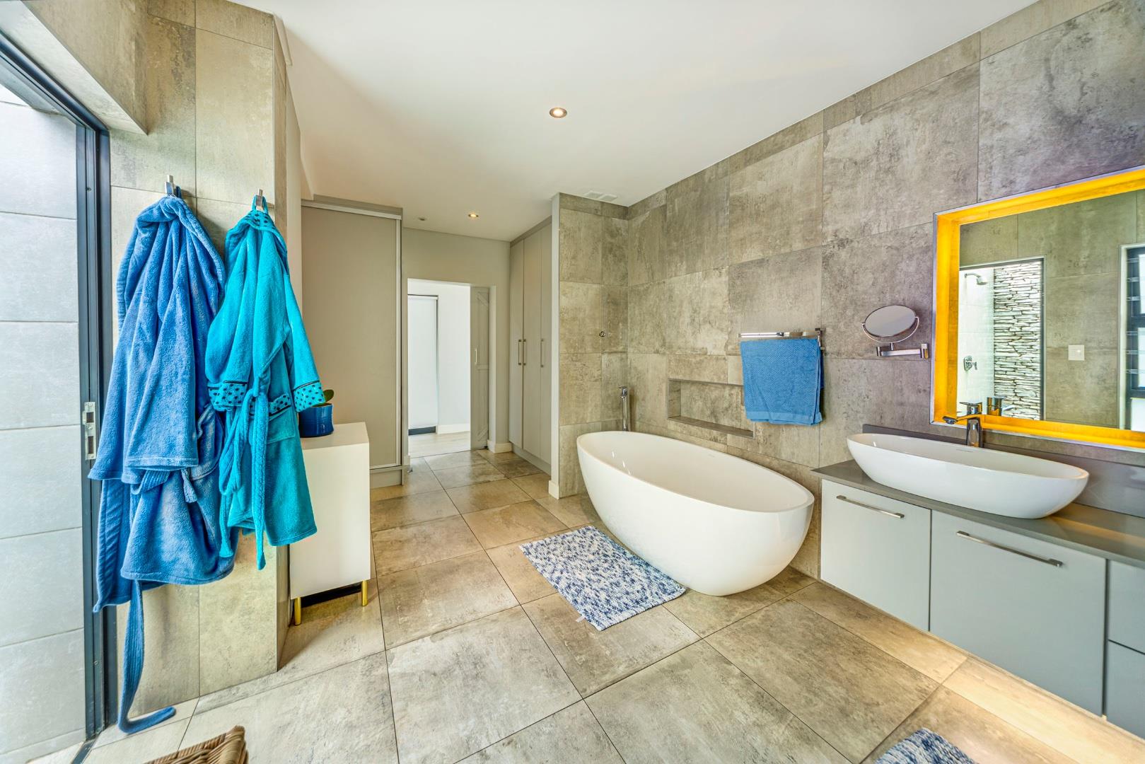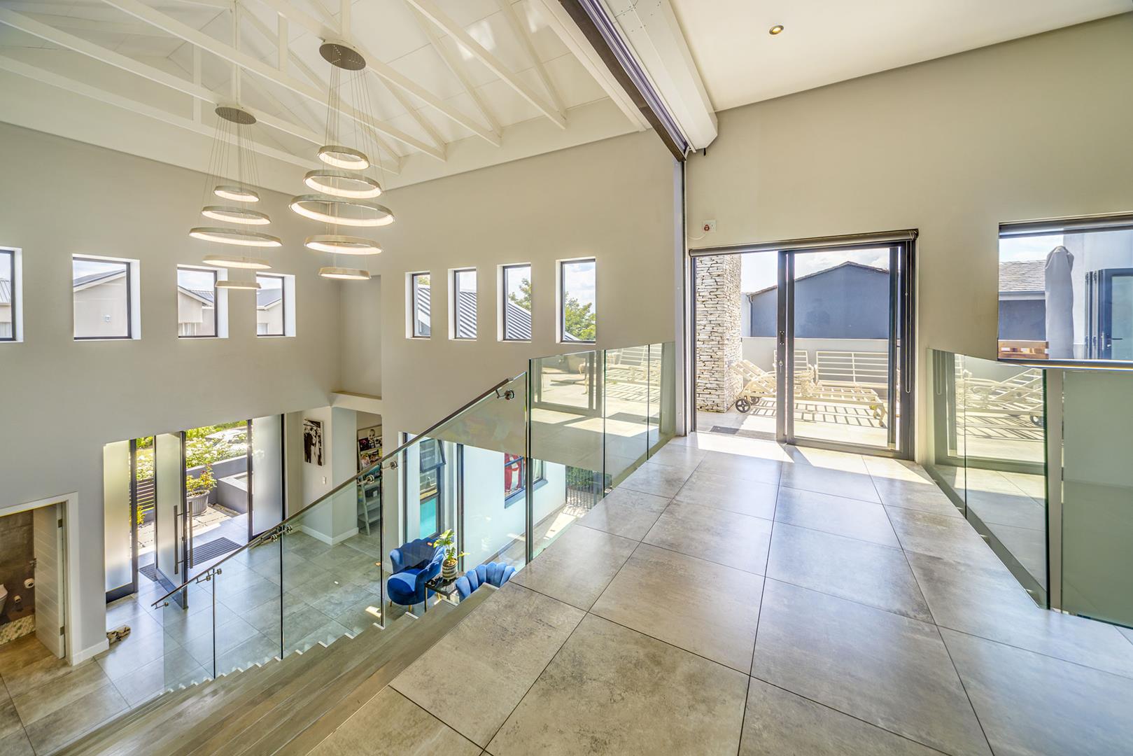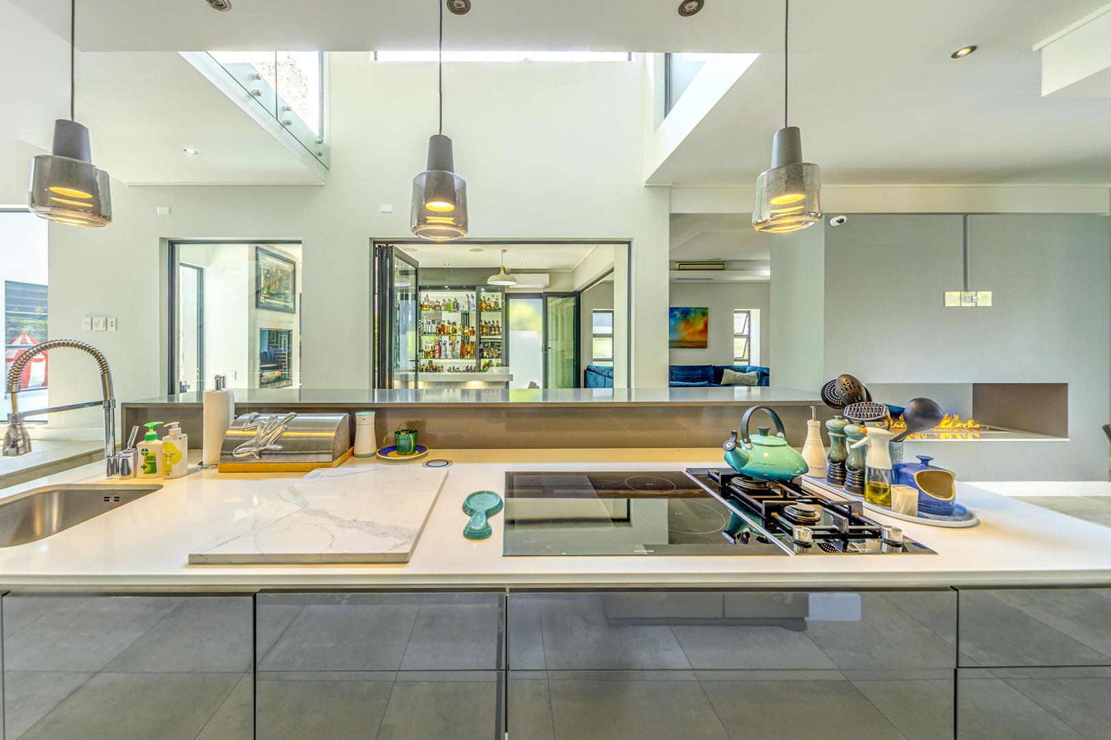 Adjacent to the kitchen, the dining area which is separated by a cozy gas fireplace into a comfortable TV lounge equipped with air conditioning. Expansive stack doors open to a sophisticated bar area with a built-in braai and bar, perfect for entertaining.
