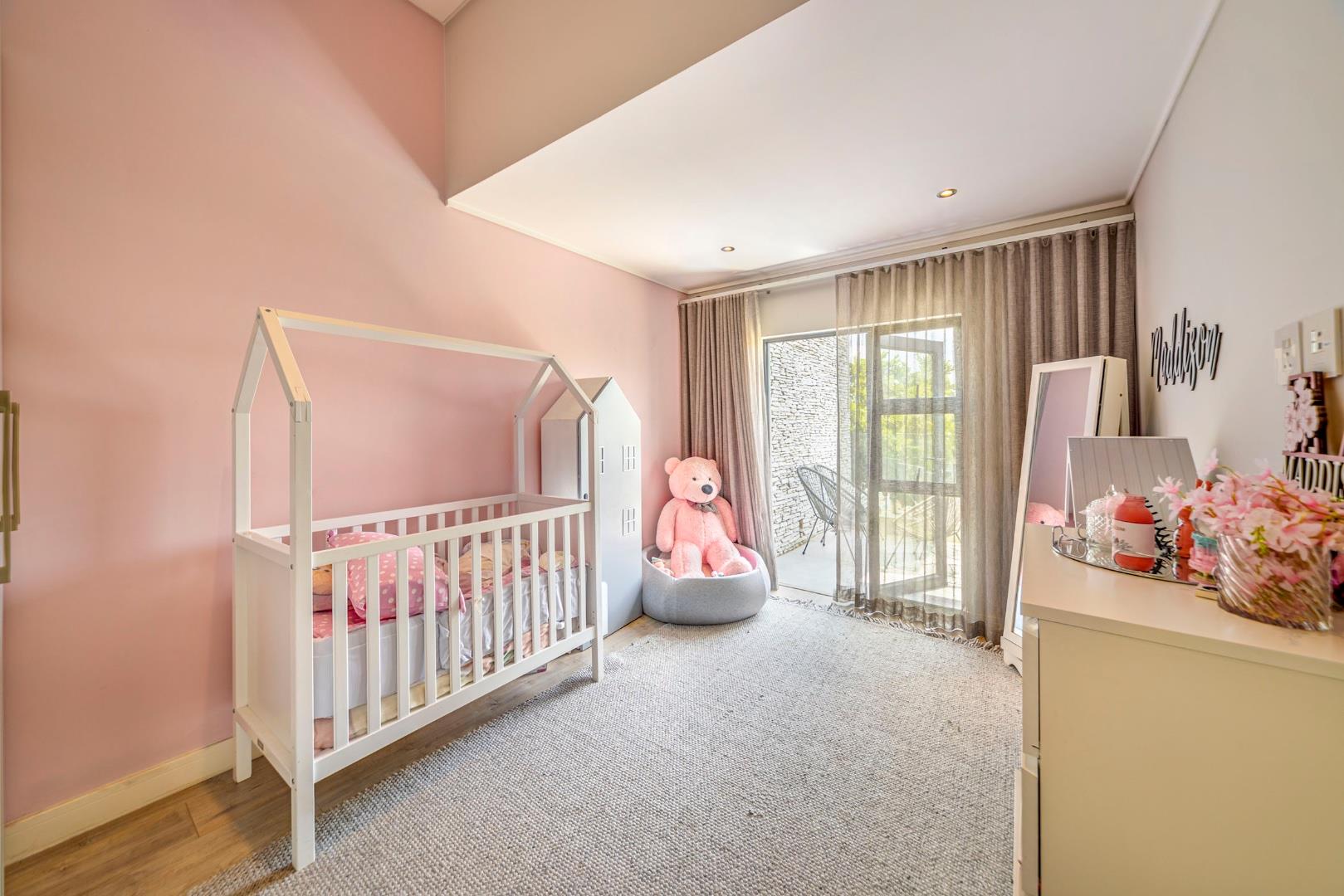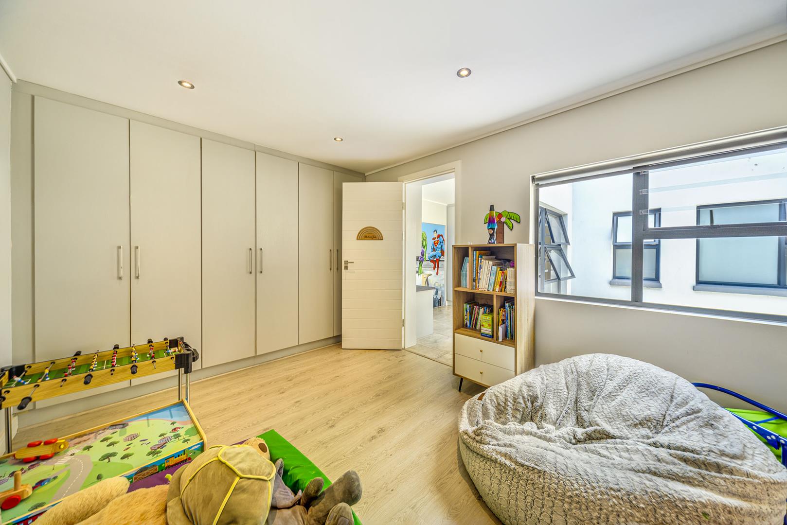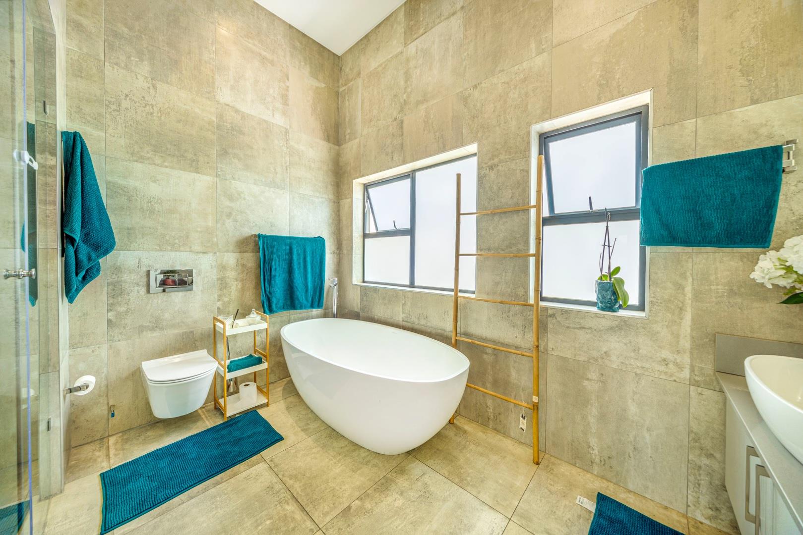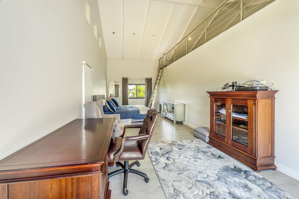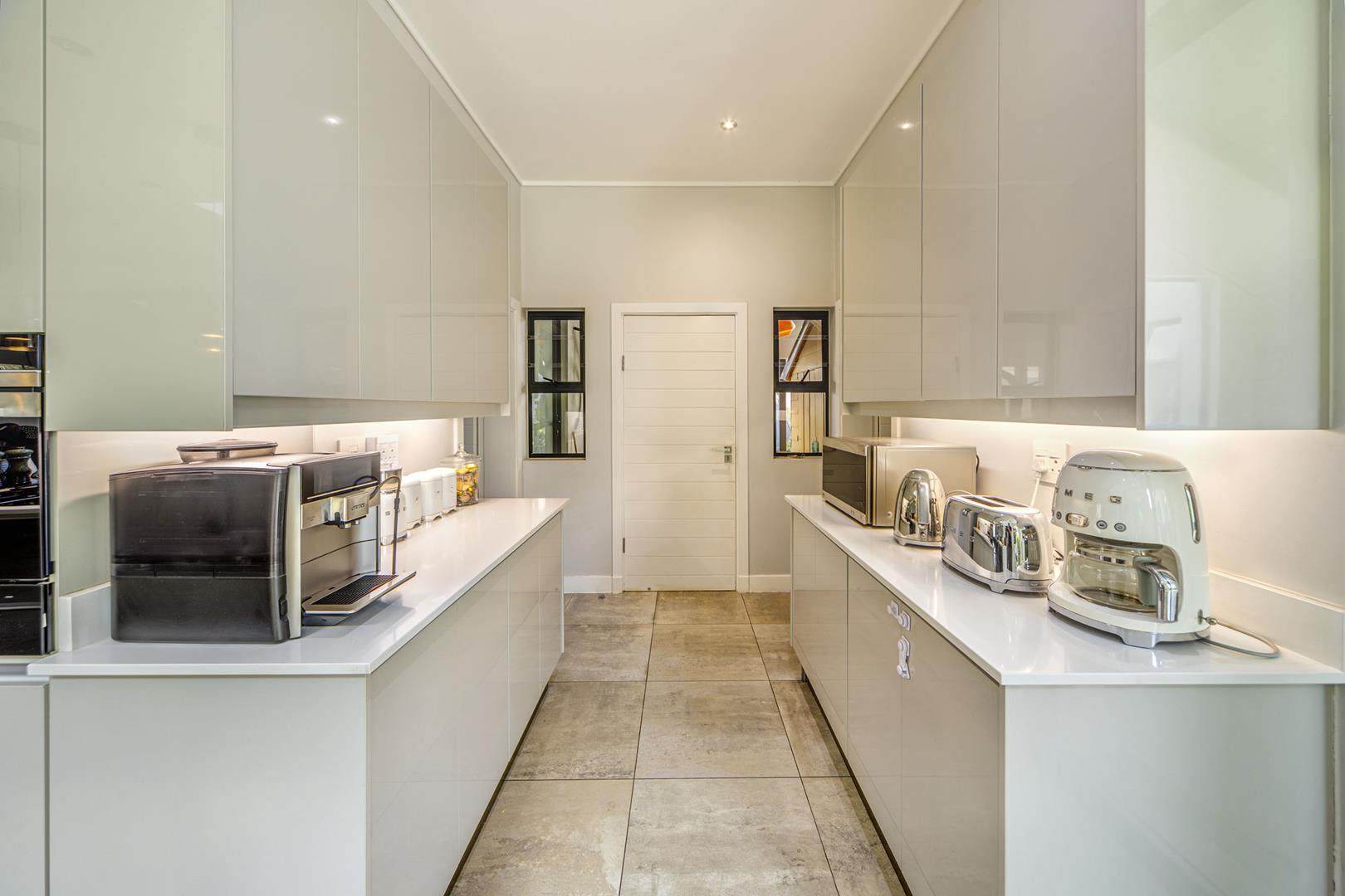Adjacent to the kitchen, the dining area which is separated by a cozy gas fireplace into a comfortable TV lounge equipped with air conditioning. Expansive stack doors open to a sophisticated bar area with a built-in braai and bar, perfect for entertaining.