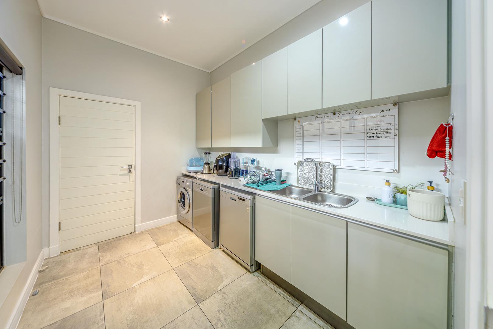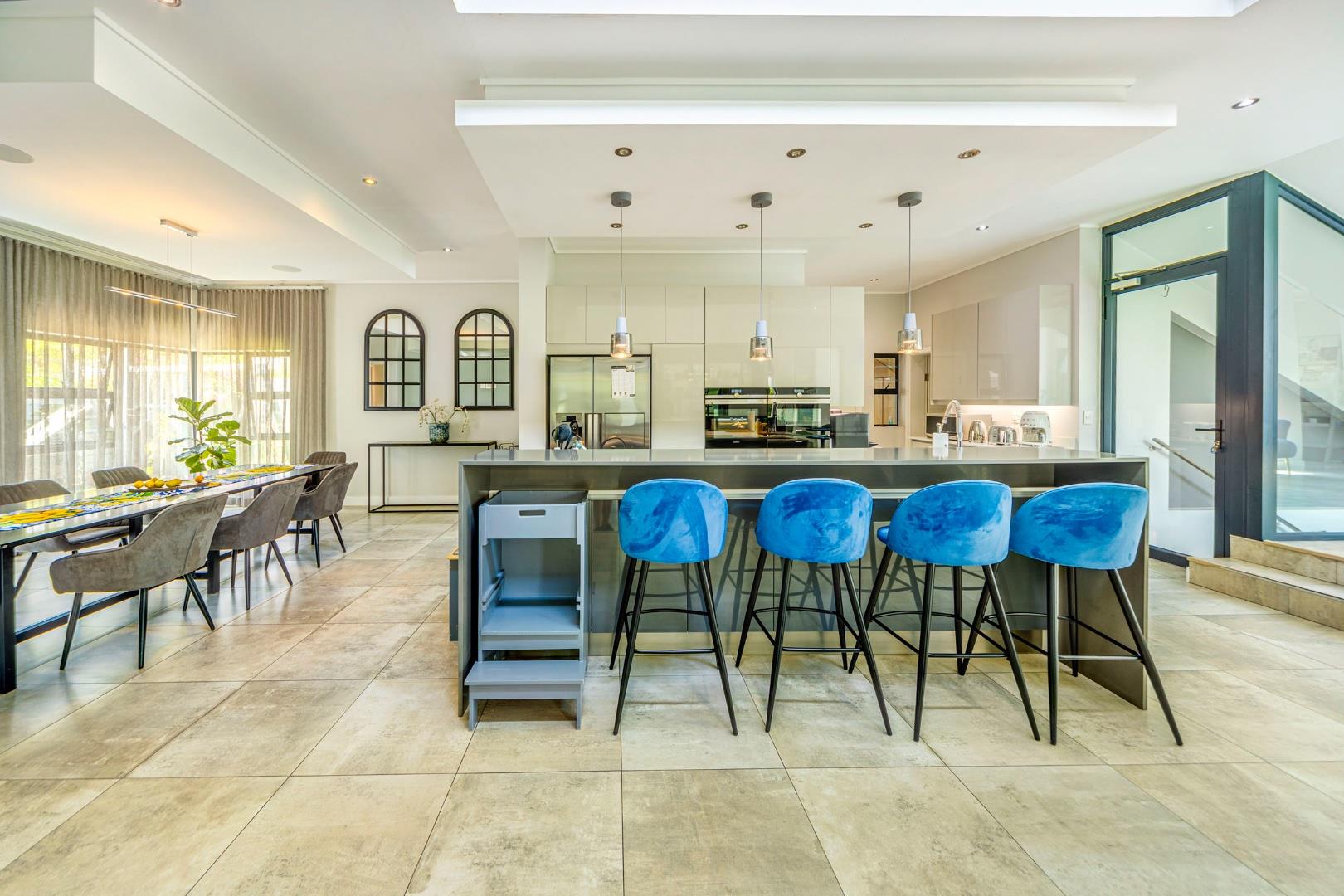 Additional amenities include gas geysers, piped gas, three garages with double and tandem parking, a 10 kW inverter with 16 panels and three batteries providing 19 hours of power, semi-home automation with sound systems in the bar, TV room, and dining area, and a 5000 litre JoJo tank with UV filtered borehole.