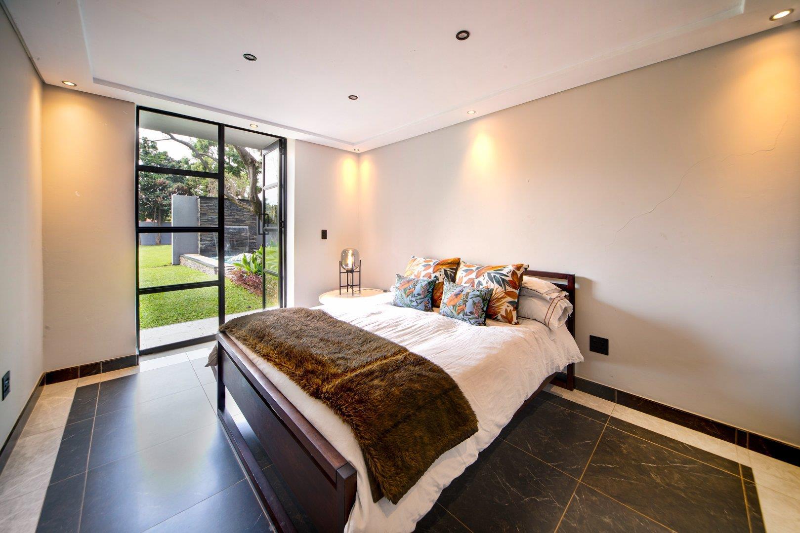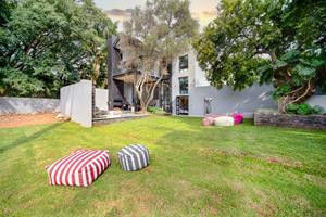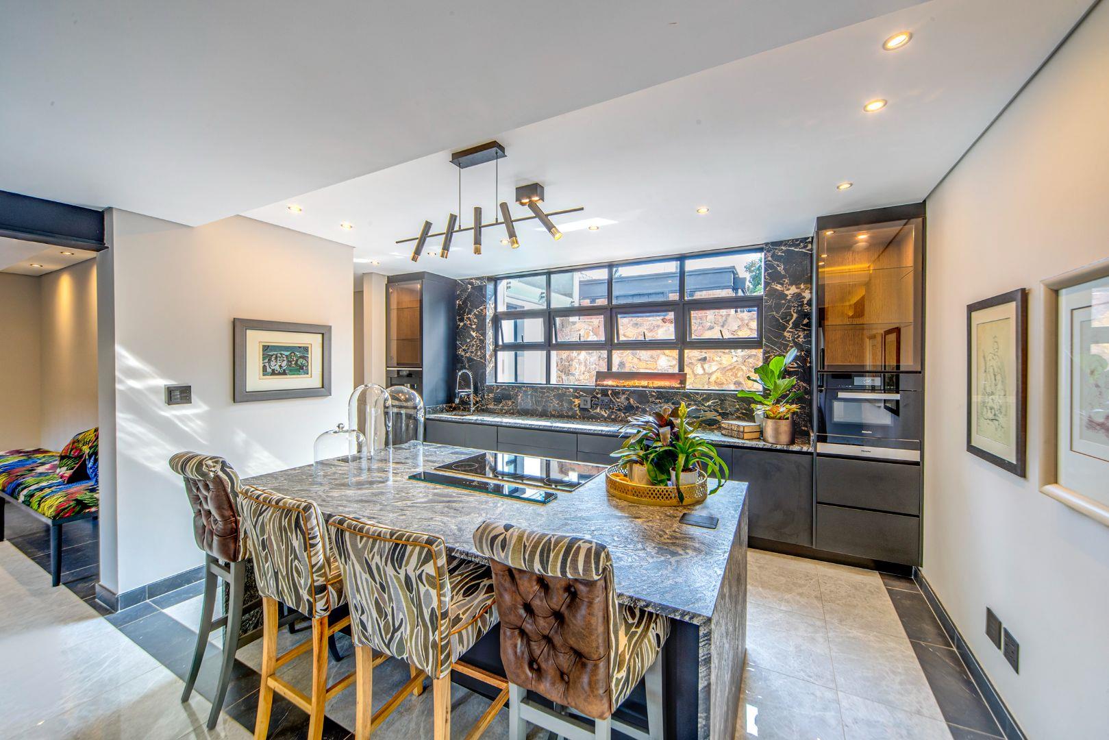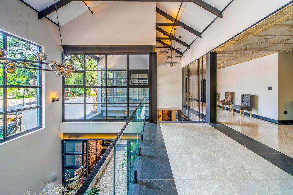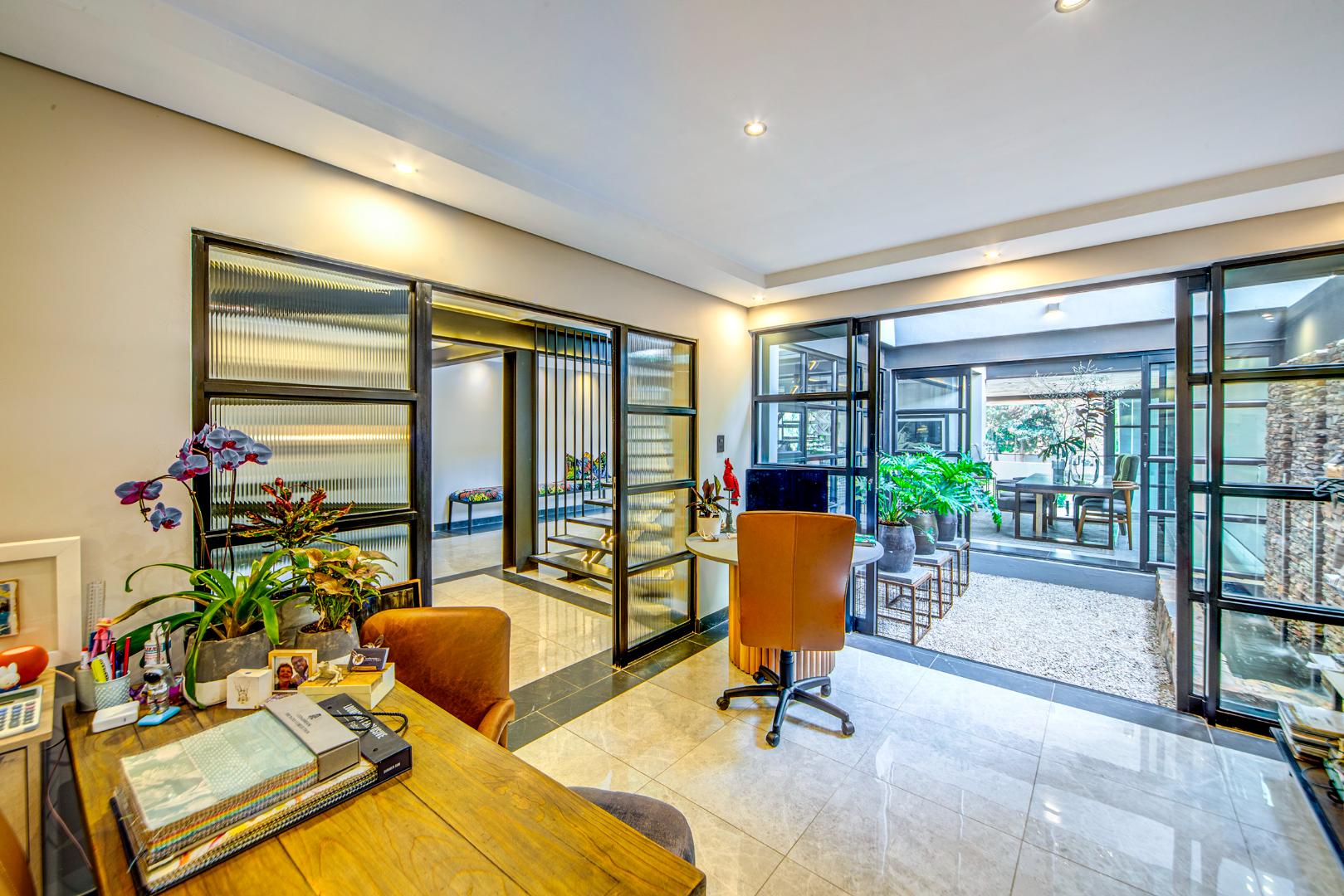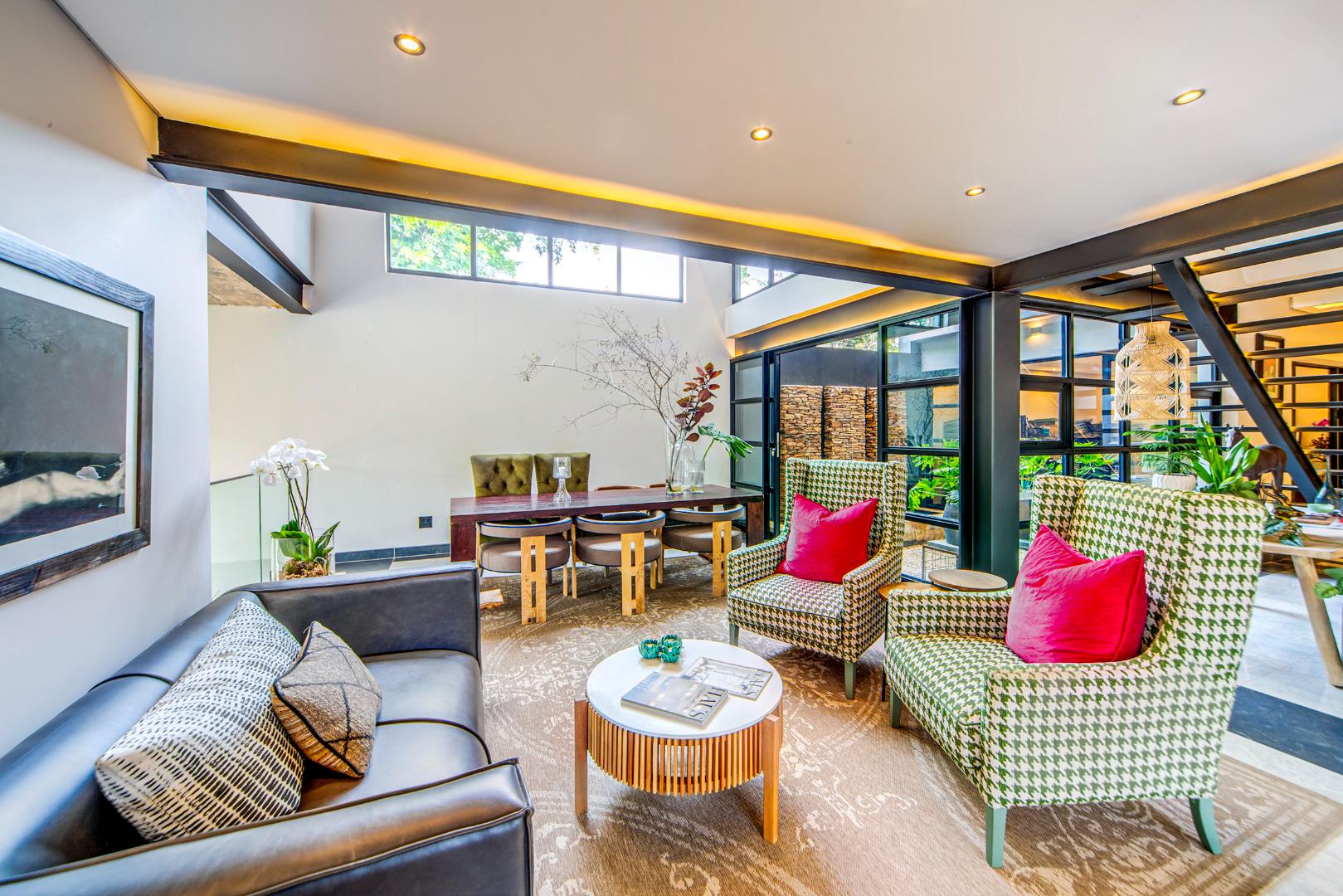 The garden level offers a beautiful double-volume lounge area, patio, braai, guest bedroom, en suite and an expansive garden with pool.
