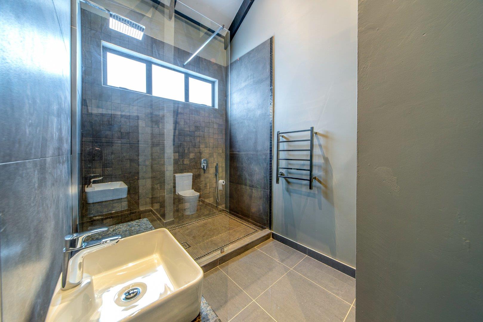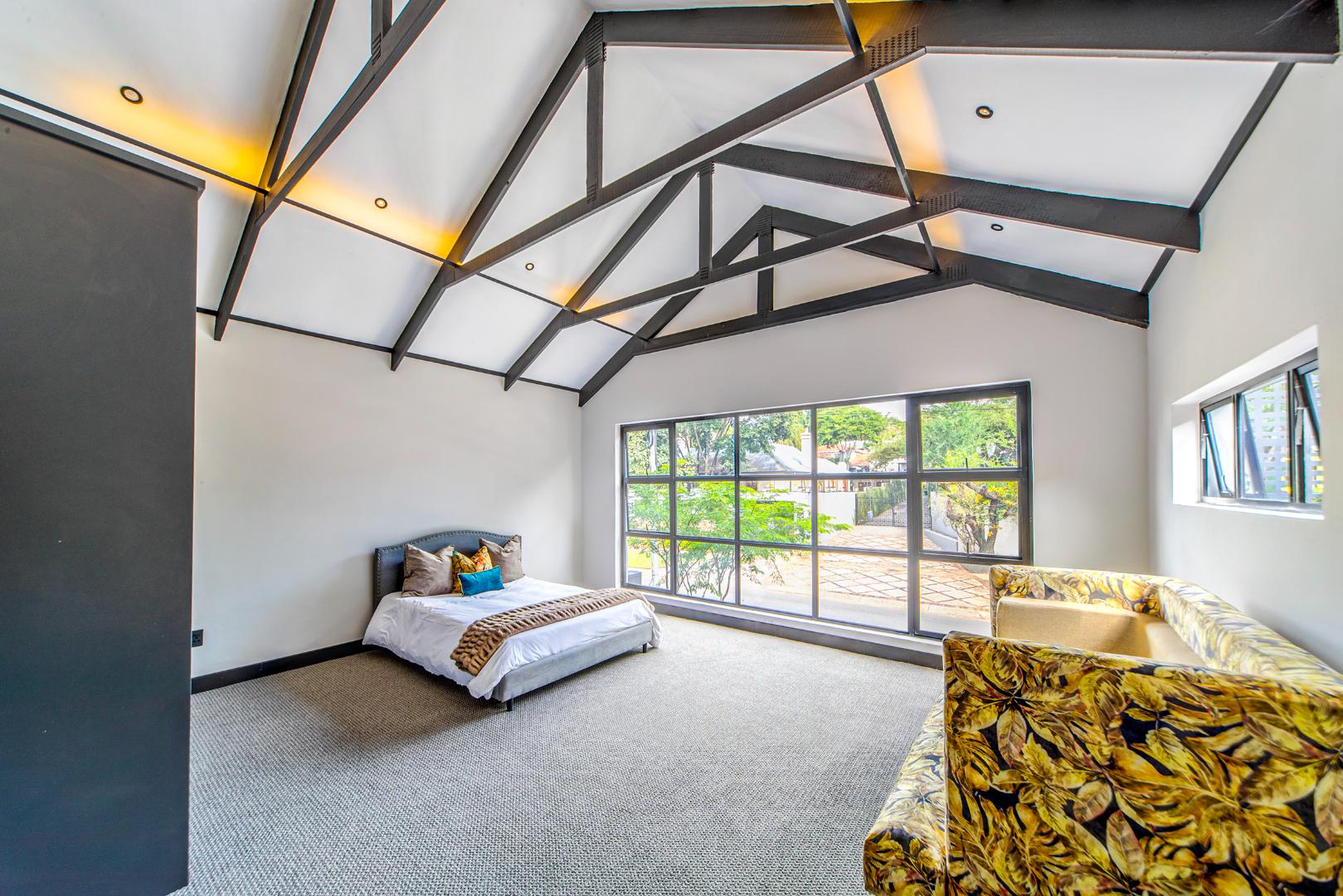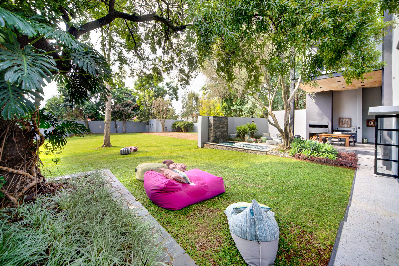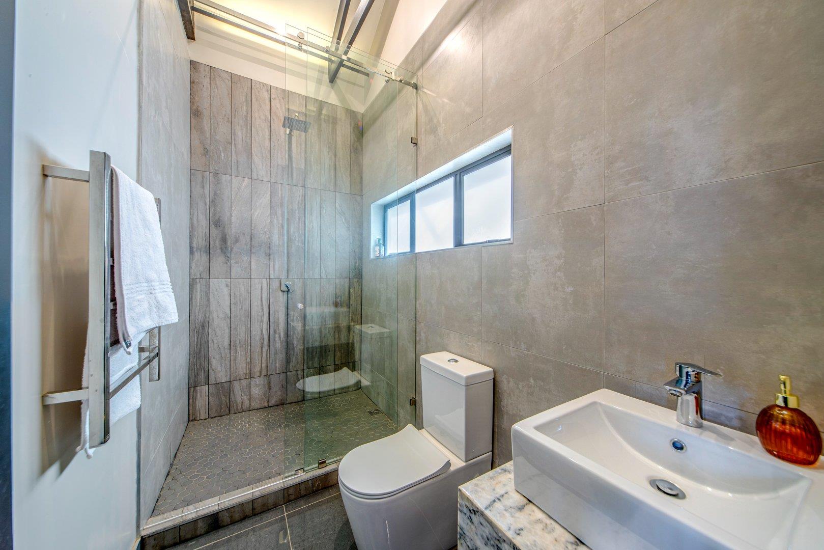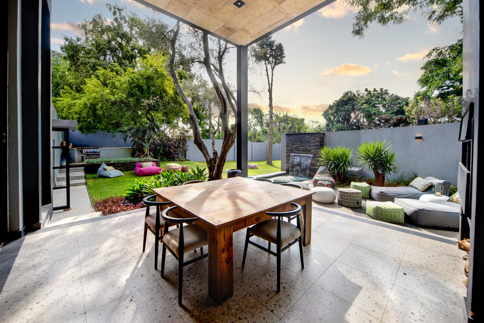 The garden level offers a beautiful double-volume lounge area, patio, braai, guest bedroom, en suite and an expansive garden with pool.