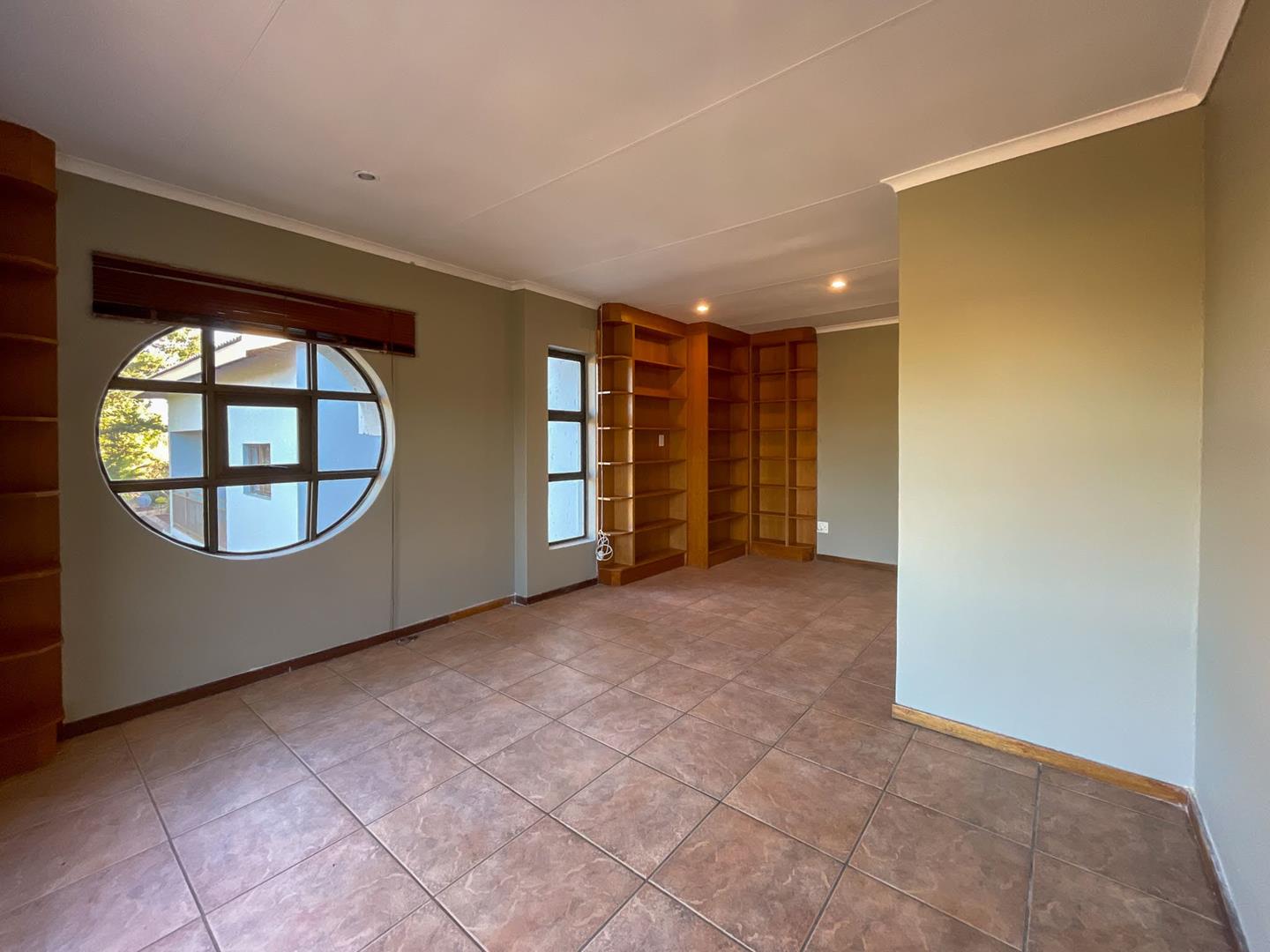 - A spacious foyer leads to a large office with built-in wooden cabinets and shelves.